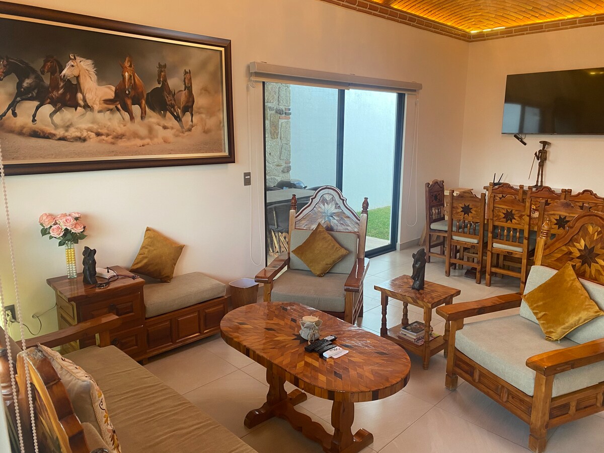 Opustite se u ovom mirnom i elegantnom prostoru, punom života sa prelepom baštom, opuštajućim đakuzijem, spektakularnim televizorom od 75 inča u sobi, da biste videli svoje omiljene filmove i serije. Takođe je veoma dobro lociran da biste u potpunosti uživali u Tequisquiapanu i okolini, kao što su prodavnice sira, vinogradi, balon na vrući vazduh, terenska vozila, konji, restorani, barovi i obilasci. Svakako posjetite Peña de Bernal, rudnike opal itd.