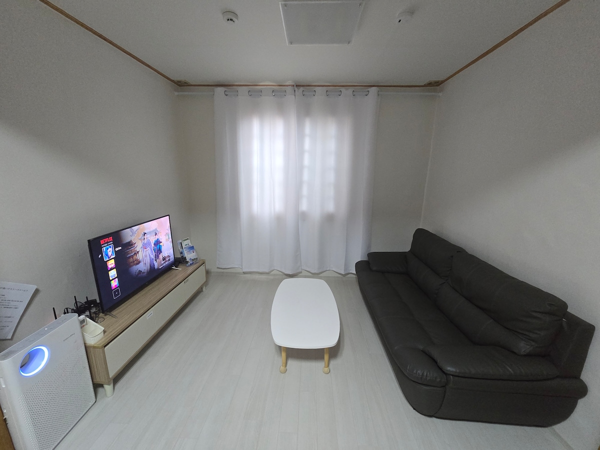 To je kuća za jednu porodicu od 30-pyeong koja je pogodna za ● porodice ili poznanike. ♥ Tokom festivala JuDong, možemo vas odvesti na lokaciju festivala automobilom domaćina. (Ograničeno na 4 gosta) ** Ako pogledate fotografiju i kontaktirate nas, period i iznos koji želite će biti prilagođeni. ★ Ovaj prostrani smeštaj je pogodan za više ljudi koji borave zajedno. U blizini ima mnogo restorana, kafića, 3 velika supermarketa, prodavnica, šetališta Namgang i parkova. Dvorac Jinju, 5 minuta automobilom. Grad inovacija za 20 minuta. Jedinica vazduhoplovstva traje 25 minuta. * Zimi postoji grejač toplog vazduha u kupatilu, tako da je toplo. * 4 klima-uređaja rade u zatvorenom prostoru.(Dnevni boravak 1. Soba 2. Kuhinja 1 oprema) * Kozmetiku, žilet, četkice za zube – ponesite svoje. * Kada za bebe. Stolica je na raspolaganju. * Mašina za pranje veša, prečišćivač vode, blender, prečišćivač vazduha, ekspres lonac, friteza, mikrotalasna rerna, ovlaživač, pegla, stalak za veš. Pogodno je jer postoje razni aparati, pribor, posuđe i pribor za kuvanje. * Povremeno mijenjamo prečišćivač vazduha i filter za prečišćivač vode.