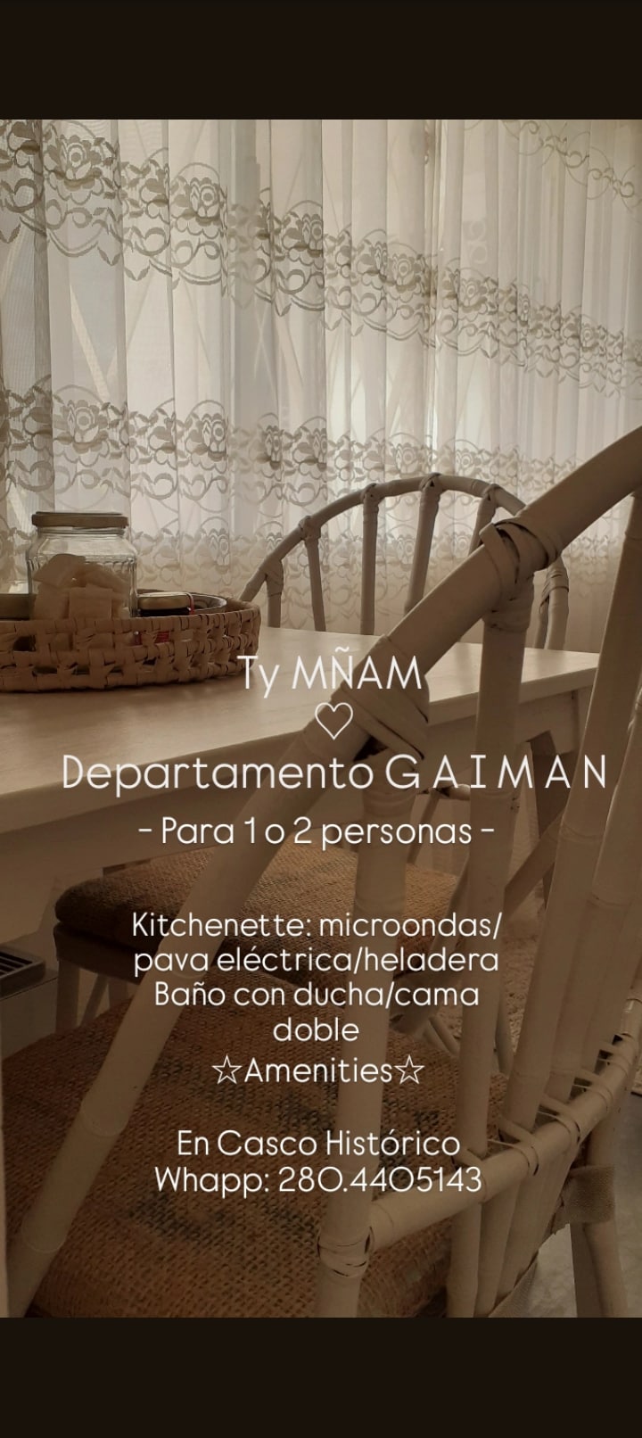 Relájate con toda la familia en este alojamient ,de un lado el río y el otro canal, rodeado de naturaleza,a cuadras del centro de Gaiman, desayuno seco con cosas muy sabrosas IDEAL PARA TU DESCANSO esperamos que vengas hacer tu recarga de pilas con la cordialidad de Carlos y Carina 🙌