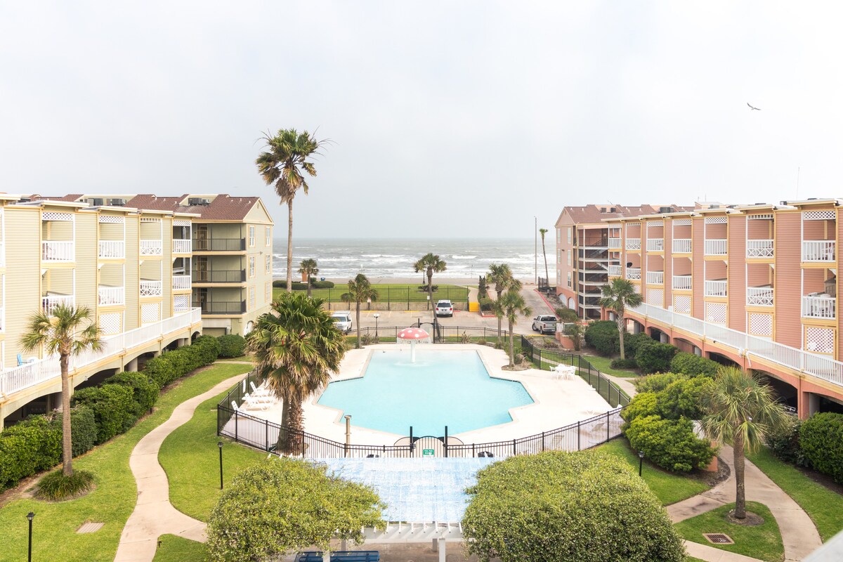 Fantastična lokacija na morskom zidu! Pogled na okean i bazen. Nedavno renoviran sa kompletnom kuhinjom. Novi bračni dušek i okvir kreveta. Dva pametna televizora sa velikim ekranom i kablovskom televizijom. Mnogo sadržaja, uključujući... Dva bazena; oba se griju tokom hladnijih dana. 2 hidromasažne kade. Roštilji na otvorenom i stolovi za piknik. Fitnes centar. Teren za tenis/krastavce. Pješice do plaže Bejb, restorana, šopinga i pristaništa za ribolov. U blizini su Moody Gardens, Pleasure Pier, Schlitterbahn, The Strand i Cruise Terminals.