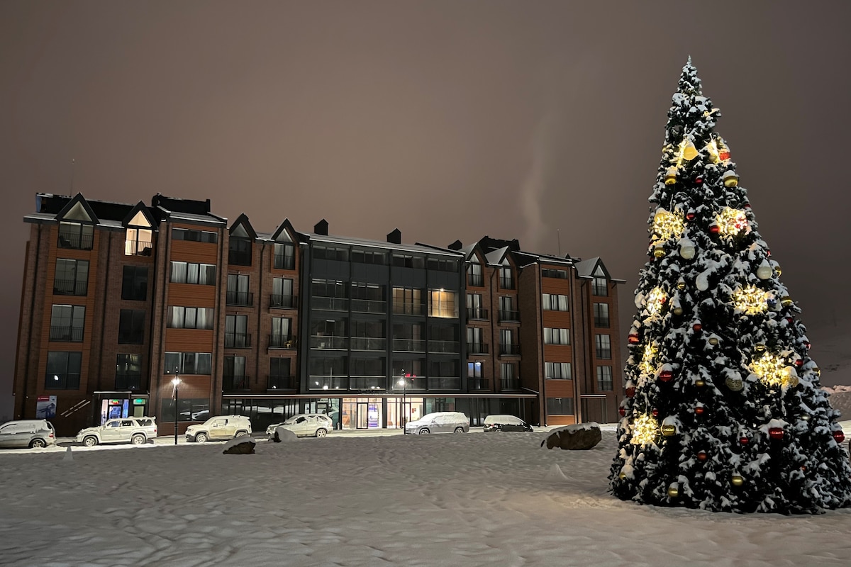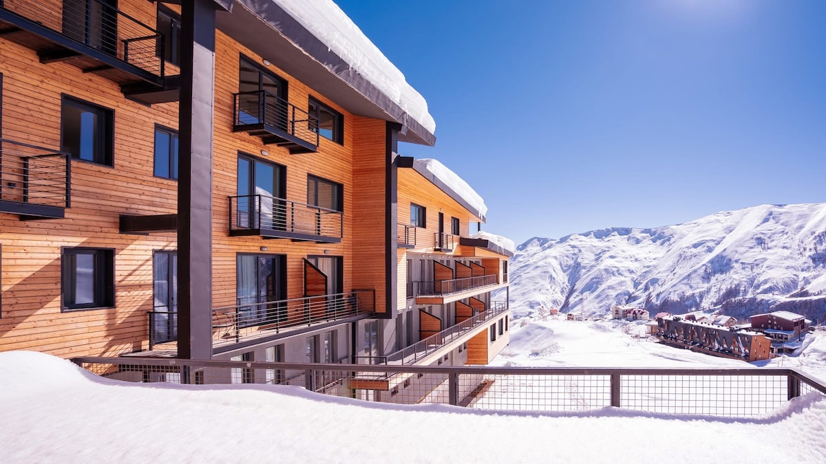 Enjoy your stay in Gudauri Ski Resort (New Gudauri) in this stylish and cozy apartment. Admire the view of the mountains. Located on the 2nd floor of the freshly built "Twins", this Gudauri Airbnb offers: 1) Self check-in. 2) Ski-in/Ski-out (100 meters away from the rope tow Gudauri ski lift). 3) Walking distance from the main activities in Gudauri: restaurants, cafes, bars, markets, ski rental, spa, etc.