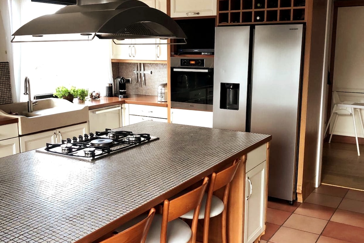 Опустите се у топлој породичној кући у мирној улици, са баштом коју је пројектовао пејзажни архитекта и сунчаном баштом са правим виноградима!Само 10 минута вожње до центра града или живописна шетња обалом од 1 сата кроз Фосвогур.Идеално за велнес: 30 минута хода до чувене Скај лагуне или локалног геотермалног базена. 10 минута до пекаре и микропиваре.Простран распоред са 4 спаваће собе, канцеларијом која се може претворити у нешто слично и салоном за забаву.Савршена комбинација природе и градске удобности. Бесплатан паркинг.