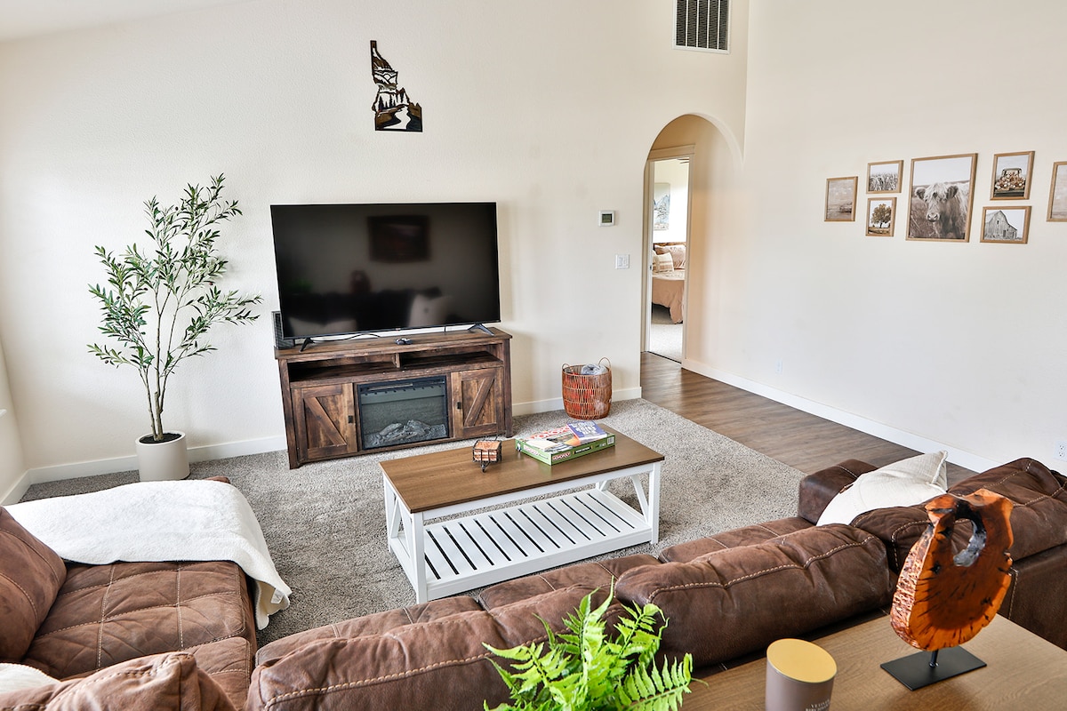 This warm, cozy home is centrally located in Boise, near Meridian & Eagle. Fully renovated, with comfy new mattresses and bedding. Large 55" TV in the family room and 32" TV in master are brand new Roku smart TVs. Backyard has a dining area, gas firepit, 6 person hot tub, and hammock. Close to the Village and easy access to downtown. Next door is the elementary school with a big playground. Garage not available for use, but there is plenty of parking on the driveway and gravel pad.