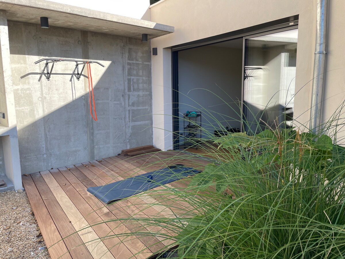 Porodična vila idealna za boravak sa porodicom ili prijateljima. Mnogo prostora 185 m² sa 4 prostrane spavaće sobe opremljene privatnim kupatilom, dobrom posteljinom (4 bračna kreveta uključujući 1 veliki bračni krevet i 1 francuski ležaj), 5 kupatila, 3 odvojena toaleta. Uživajte u radnom stolu, teretani i prostoru za igre (flipper, arkadne igre). Spolja: travnjak za kuglanje u potpuno ograđenoj bašti. Mirno stambeno naselje u blizini Nima. Brzi Wi-Fi, Netflix. Sve pogodnosti za nezaboravne trenutke!
