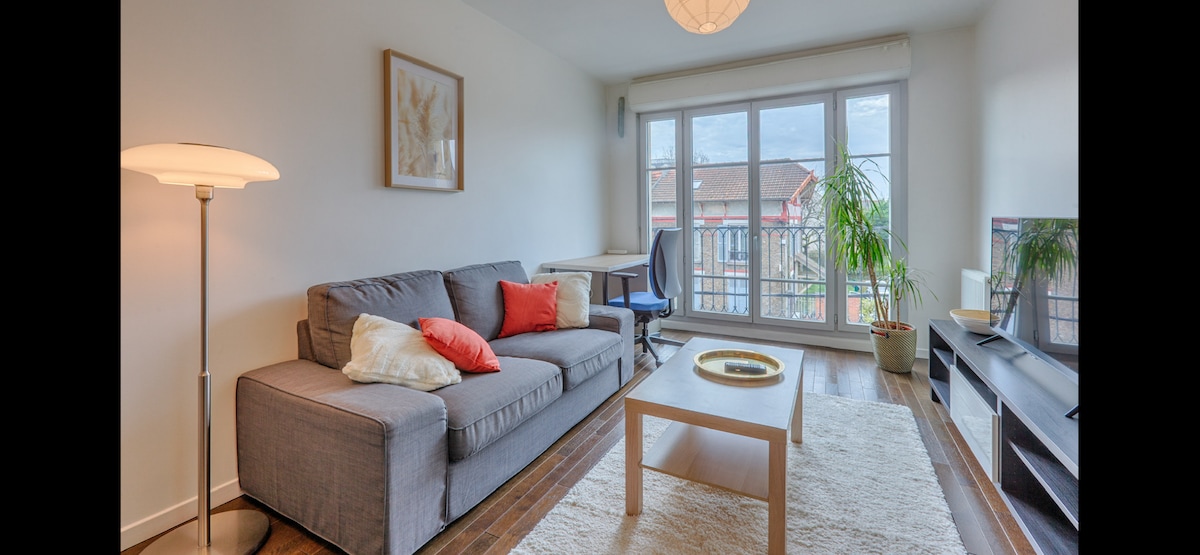 Opustite se u ovom mirnom, elegantnom, renoviranom domu od 55 m2 sa balkonom i 2 parking mesta u mirnoj rezidenciji je bezbedna. Nalazi se na sedam minuta hoda od železničke stanice i pristup autoputu A13 udaljenom 250 m, prodavnicama i restoranima peške . Potpuno opremljen apartmanski kauč, TV spojen, hifi sistem Bose, trpezariju sa stolom i stolicama. Spavaća soba sa jednim bračnim krevetom (160 cm), pametnim TV-om ( netflix) Kupatilo ( peškiri) Mašina za pranje veša