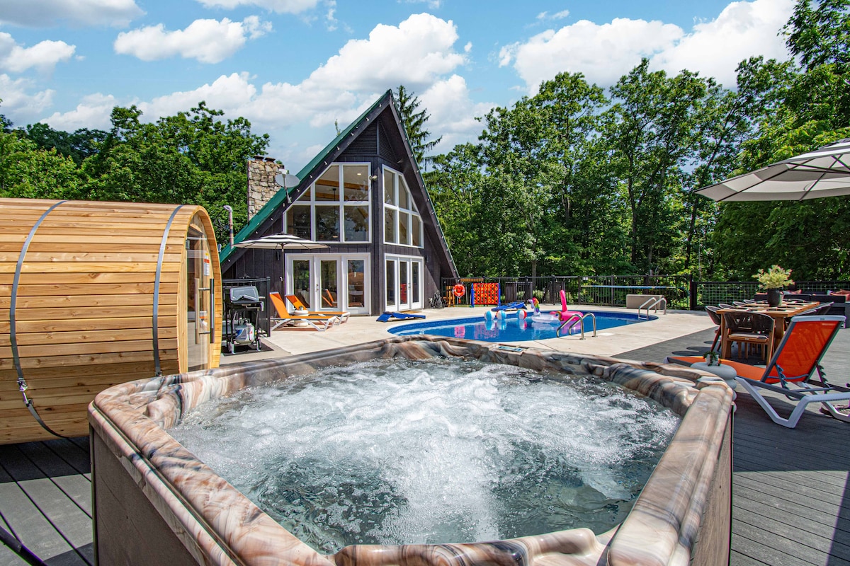Pobjegnite u Three Pines Lodge, zadivljujuće moderno utočište okupano prirodnim svjetlom i okruženo veličanstvenim pogledom na planine. Uživajte u pejzažu kroz prostrane prozore ili iz prostora za zabavu na otvorenom. Dizajnirana za sve uzraste, ova luksuzna kuća za odmor nudi vrhunske sadržaje, uključujući hidromasažnu kadu, video igre, Peloton bicikl i još mnogo toga! Iskusite udobnost bez premca i stvorite nezaboravne uspomene sa svojom porodicom. Rezervišite smještaj Smoky Mountain u smještaju Three Pines Lodge još danas!