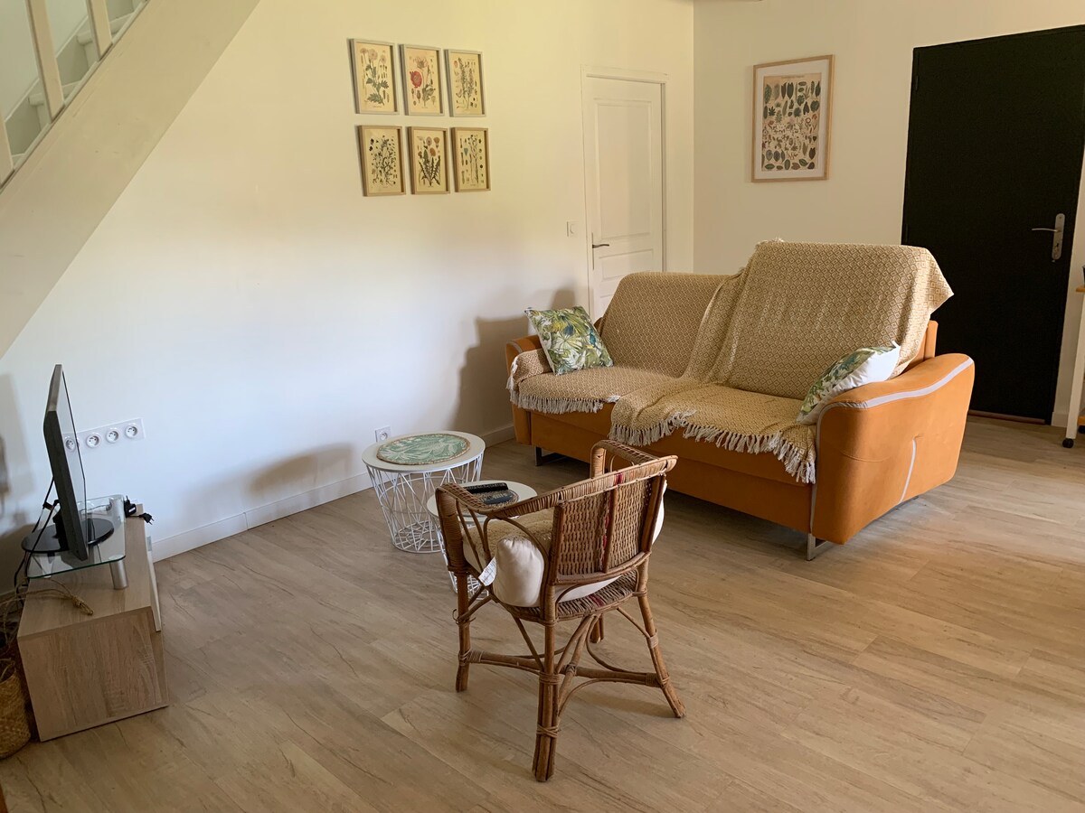 Mirna kuća sa baštom od 1000 m² potpuno ograđena u ćorsokaku u ćorsokaku, udaljena je 15 minuta hoda od centra grada, u blizini Bašte biljaka, prodavnica i autobuske stanice u blizini. Dnevna soba, dnevna soba, opremljena kuhinja, kupatilo, spavaća soba u prizemlju (krevet 140) i spavaća soba na mezaninu (krevet 140). Klima uređaj. Besplatan parking u sklopu objekta ispred kuće. Pristup obilaznici je udaljen 3 minuta.