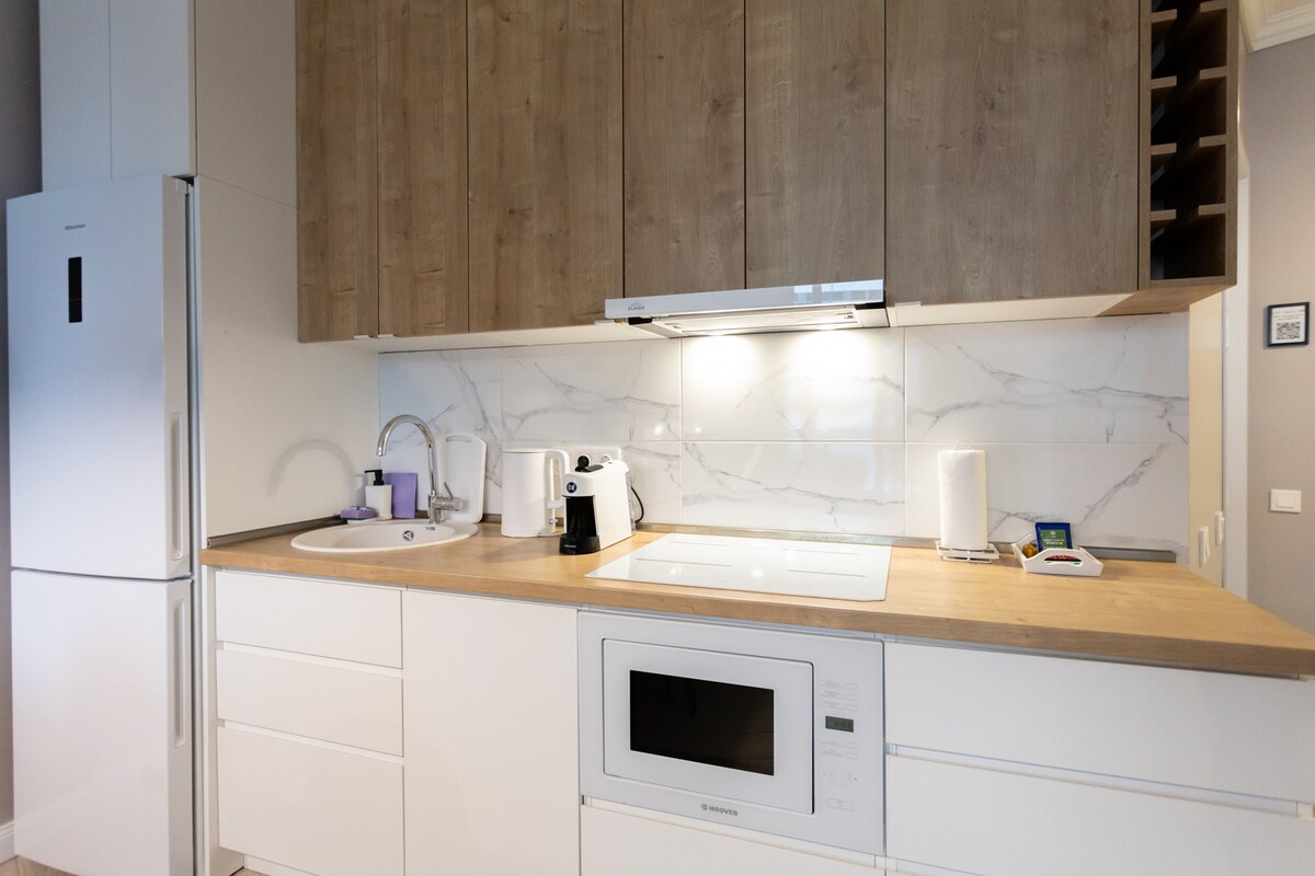 The apartment is a prestigious ecological clean area on the territory of the hippodrome. Studio with all conveniences, one bedroom large bathroom, a kitchen is equipped with home appliances and it has a large balcony. The total area is 55 sq.m. Апартамент находится престижном экологический чистом районе на территории бившего ипподрома. Номер студио со всеми удобствами, ванной комнатой, кухней, с прихожим и с большим балконом. общая площадь 55 кв.м.