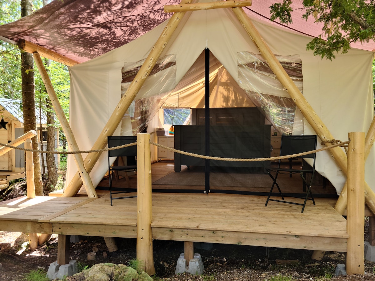 Prekrasan glamping šator na 3 šumovita hektara od Hwy6 Hepworth. Udoban bračni krevet, pomoćni stočić, tepih. Samostalna prijava iodjava. Šator ima struju i ventilator. Ekskluzivan pristup BBQ-u i vatrogasnoj jami dok ste ovdje. Outhouse sa dostupnim kompostnim WC-om. Unutrašnji tuš iumivaonik sa toplom tekućom vodom u zasebnoj zgradi. Objekat je povezan sa NorthernDunes GolfClub. 1min od TimHortons, 7 minuta od SaubleBeach &Wiarton. SVE pozadine su dobrodošle. 420 prijateljski.