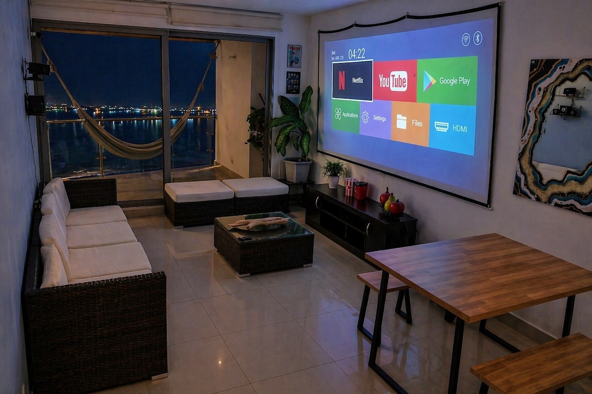 This exclusive duplex offers a one of a kind luxury experience in Cartagena. Just 5 minutes from the airport and close to the historic center, it has a jacuzzi in the room with panoramic view, pool table, Balcony pin pon, and video game machine. In addition, its projector will allow you to enjoy movies on a giant screen. Private balcony, outdoor shower. Every detail is designed to provide you an indulgent and luxurious stay, combining comfort and entertainment in one place.