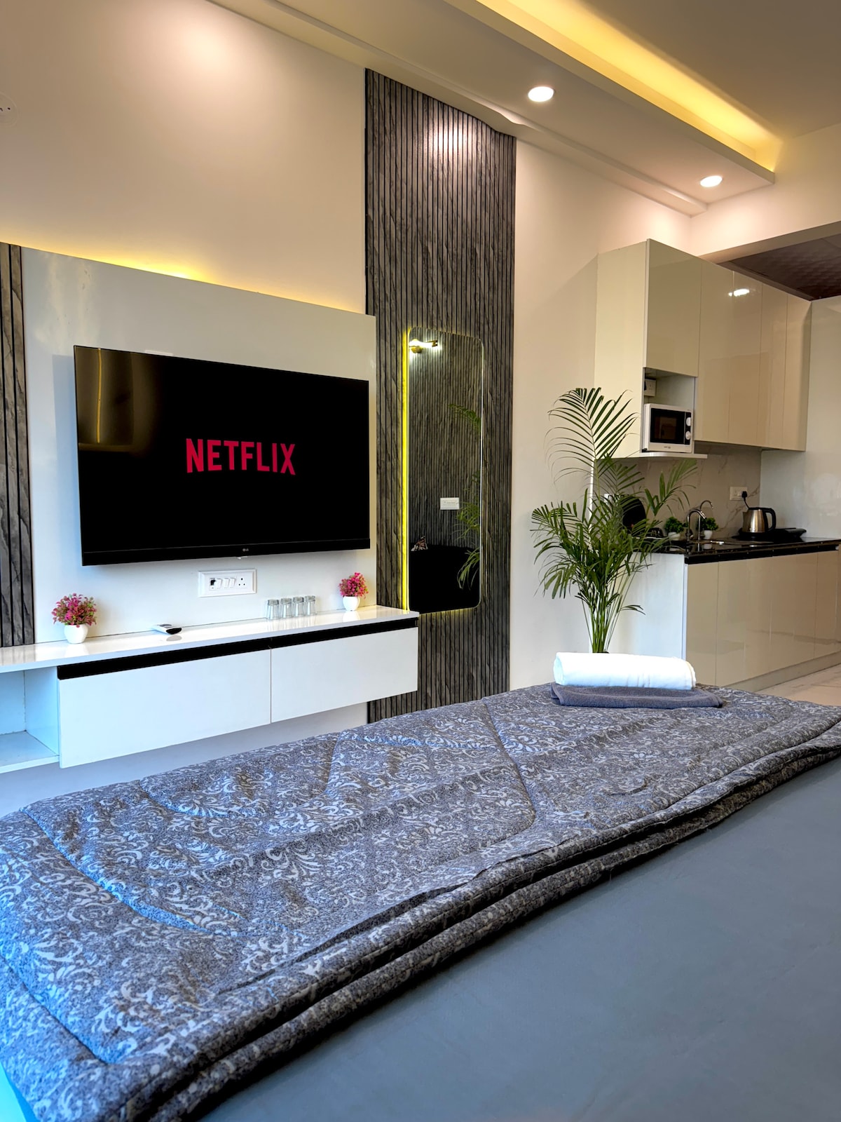 Our newly constructed 2 BHK apartment blends modern comfort with natural charm. The space features 2 serene bedroom with a queen-size beds, a spacious living room, a well equipped kitchen, 2 bathrooms: one attached to the master bedroom and another accessible from the living room and second bedroom and L- shaped balcony offering great view of the city. The property is located near a premium mall in Noida! This well-situated location offers you the convenience of shops, cafes, and entertainment.
