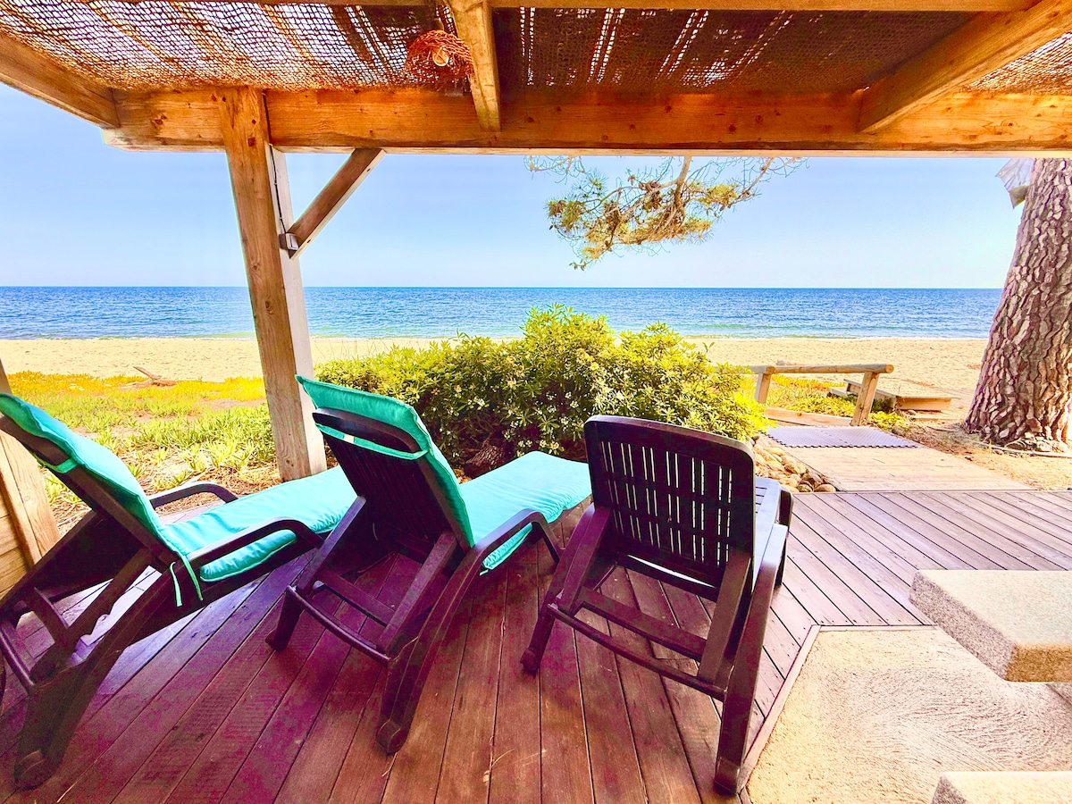 In front of the sea, among the pine trees and recentely renovated, The Bungalow is built directly on the beach. All its guest can enjoy meals and "fareniente" on the terrace shaded by its white pergola. Some steps below and you're on the beautiful VIGNALE Beach where your can enjoy privacy sunbathing on deckchairs and of course relaxing sea swimmings. Its wide plate-glass window gives direct access on the terrace and allow to live confortabily as inside as outdoor, facing the sea.
