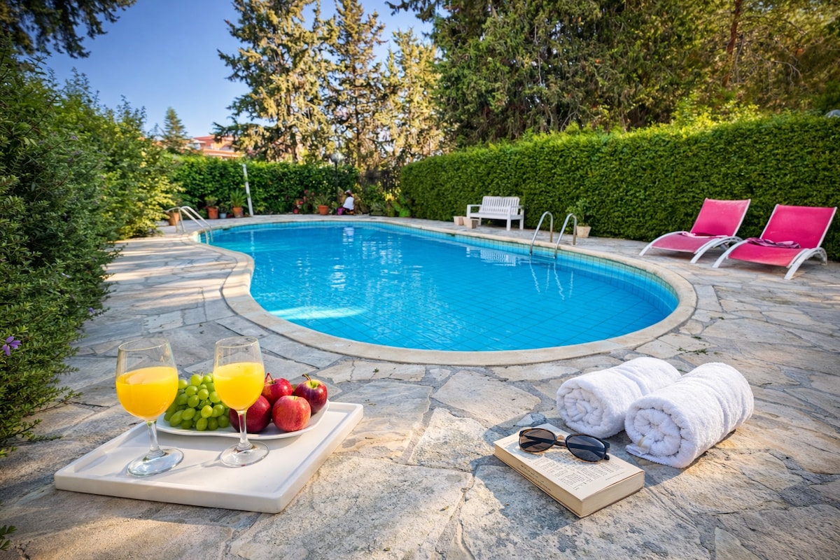 Prostrana kuća sa velikim dvorištem i baštom u prirodi u zelenom okruženju. Idealna atmosfera za mir i odmor. Naš smeštaj je bezbedno mesto za decu. U dvorištu su igračke, a društvene igre kod kuće. Za djecu i bebe imamo krevetac za bebe, sigurnu stolicu za bebe za ručak i sedište za bebe. Naš smještaj se nalazi u selu Mesogi, 5 km od centra grada Pafosa i gradskih plaža. Gosti mogu da probaju naše organsko povrće i voće svake sezone, dostupno u dvorištu.