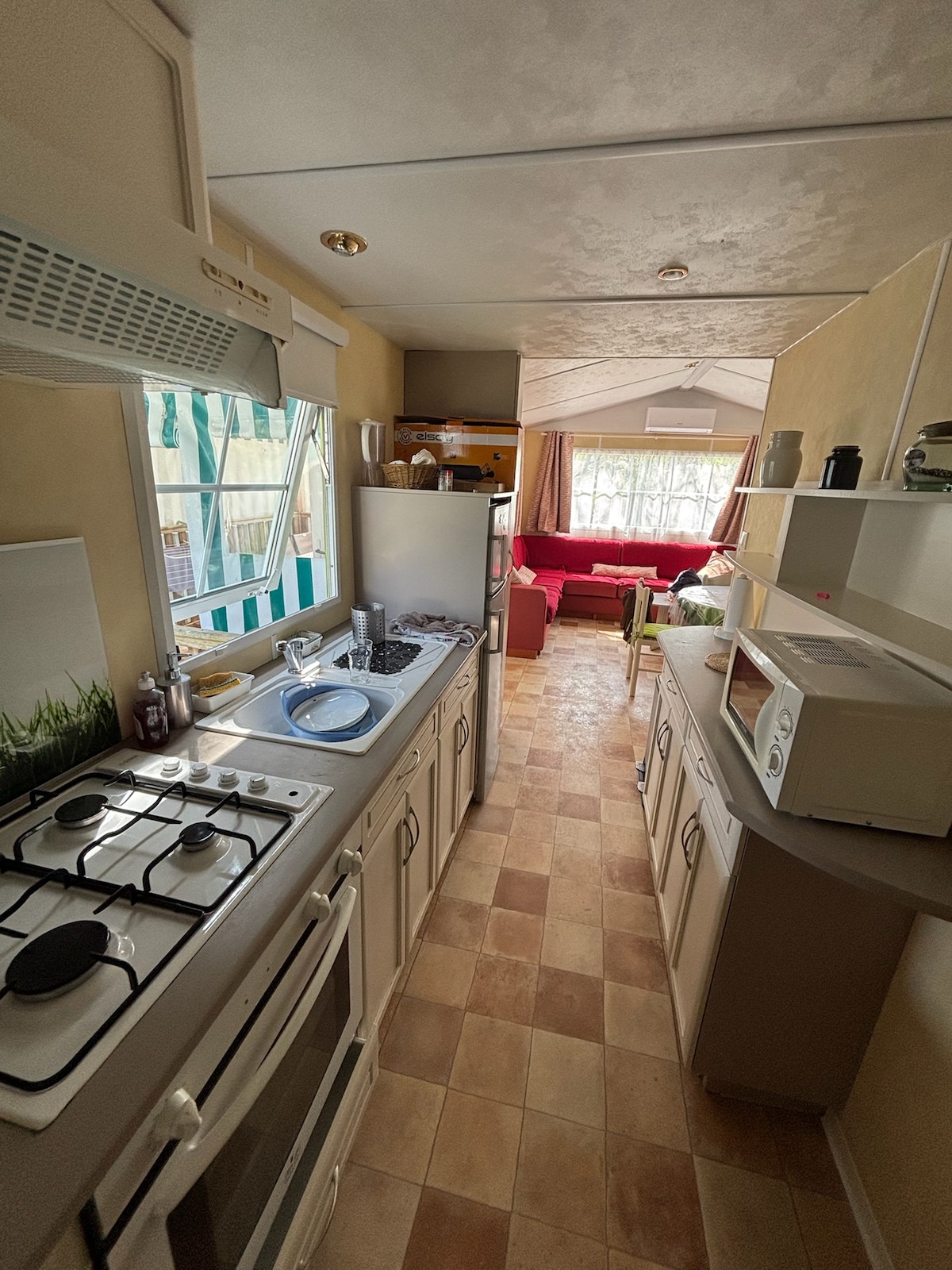 Ce logement paisible offre un séjour détente pour toute la famille. Le mobil-home est composé d’une grande terrasse fermée avec cuisine équipée et frigo (compartiment congélateur). Il dispose également de 3 chambres dont une suite parentale avec accès direct à la salle de bain. Cuisine à l'intérieur avec four, et un deuxième grand frigo/congélateur. WC séparé. Nous vous encourageons vivement à utiliser les douches communes du camping, plus spacieuses et plus pratiques surtout après la plage.