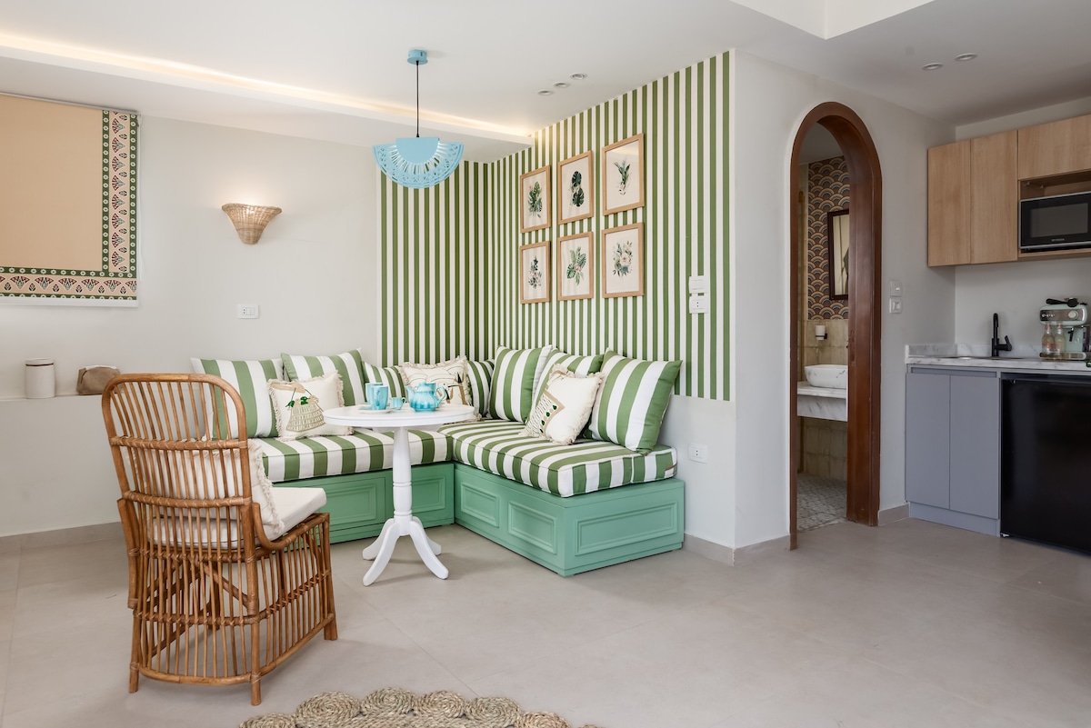 Dobro došli u jedinstveno utočište na samo 5 minuta od piramida! Ovaj studio nudi panoramski pogled na piramidu i privatnu hidromasažnu kadu. Prostor se odlikuje faraonskim dizajnom, sa jedinstvenim dekorom i arhitektonskim detaljima koji stvaraju istorijski, prijatan ambijent. Uživajte u bračnom krevetu, trpezariji, čajnoj kuhinji i privatnom kupatilu. Gosti takođe imaju pristup zajedničkoj krovnoj terasi sa zadivljujućim pogledom za nezaboravan boravak.