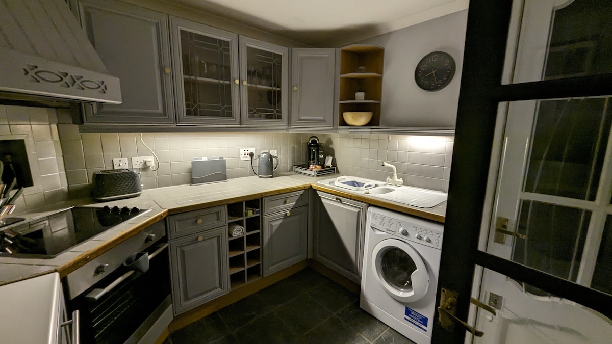 Self-contained private annex with lounge/small food prep area and separate bedroom wirh en suite/electric shower and walk-in cupboard. Lounge has ethernet/ WiFi and 43” 4K Smart TV with Netflix. Coffee machine/milk frother, fridge, microwave, toaster, portable hob and kettle. Tea/coffee, porridge and cereal provided. Snacks left on arrival - pastry/ biscuits, fruit and dairy items. Private entrance/keylock garden/patio. On longer stays washing/drying of small amounts of clothing.