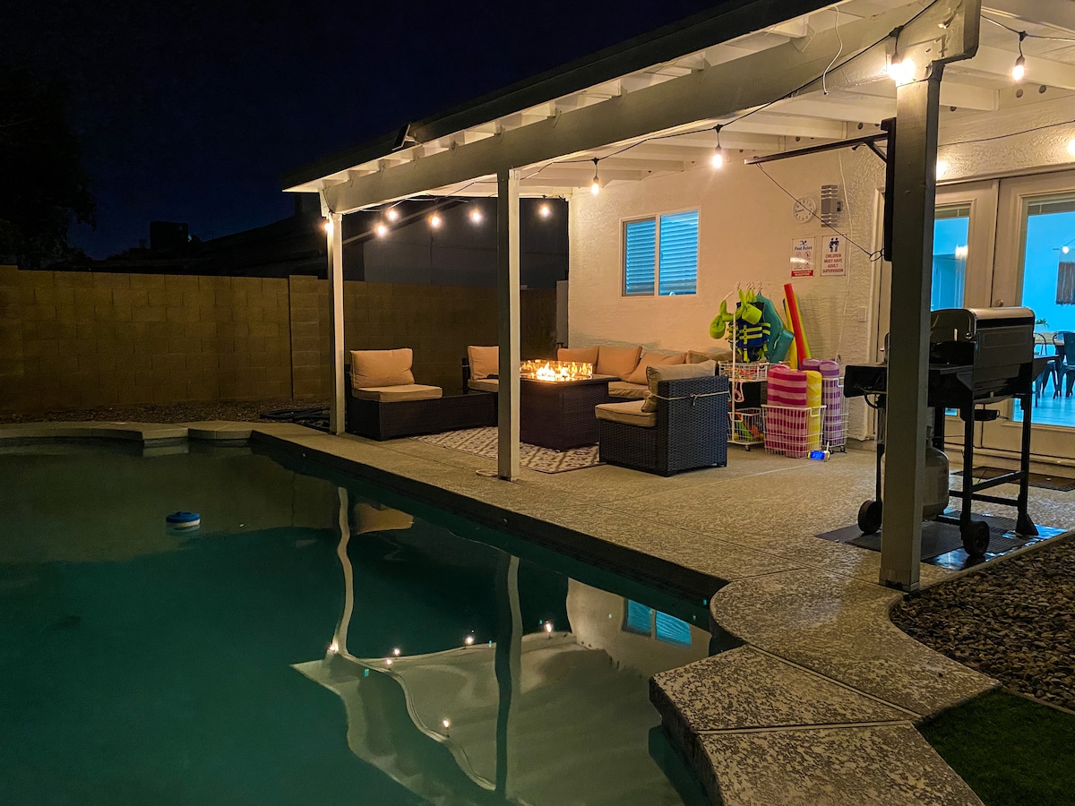 Feel at home in this bright, cozy retreat with everything you need. Just 11 miles to State Farm Stadium and right off the 101. Enjoy the tranquil lake views while enjoying your coffee and listening to the chirping birds. Have cocktails while watching stunning sunsets. Relax outside grilling, unwinding by the fire pit, or swimming in the pool. POOL/SPA heat available for a fee. Minutes from top restaurants, golf, and shopping. Explore Arizona! 👉 “Book your stay now!” *Lake is for viewing only.