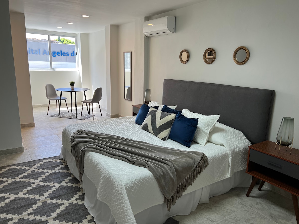 - Udoban i ekskluzivan studio za rukovodioce sa bračnim krevetom, radnim stolom i klima-uređajem. - Balkon za svjež vazduh - Opremljena kuhinja. - Ulaz sa elektronskom bravom i prilagođenim i ekskluzivnim ključem za svakog gosta. - Panoramska krovna terasa s restoranom na 9. nivou - Soba za sastanke opremljena za profesionalne sastanke (provjerite dostupnost) - Pristup non-stop sa prilagođenim kodom. VAŽNO: Nemamo privatni parking u sklopu objekta.
