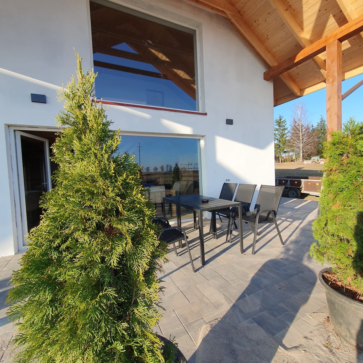 Vrlo atmosferska, udobna i istovremeno prostrana kuća sa kaminom tokom cijele godine, smještena na odličnom mjestu, na samoj plaži pored jezera Śniardwy. Kuća površine oko 150 m2. Na spratu su četiri spavaće sobe i kupatilo sa tušem. U prizemlju se nalazi prostrana kuhinja sa trpezarijom, dnevnim boravkom i kupatilom sa tušem. Tokom ljetnje sezone gosti mogu da uživaju u prostranom spoljnom bazenu koji se nalazi pored kuće. Roštilj i ognjište. dvije terase, jedna natkrivena Velika bašta i parking