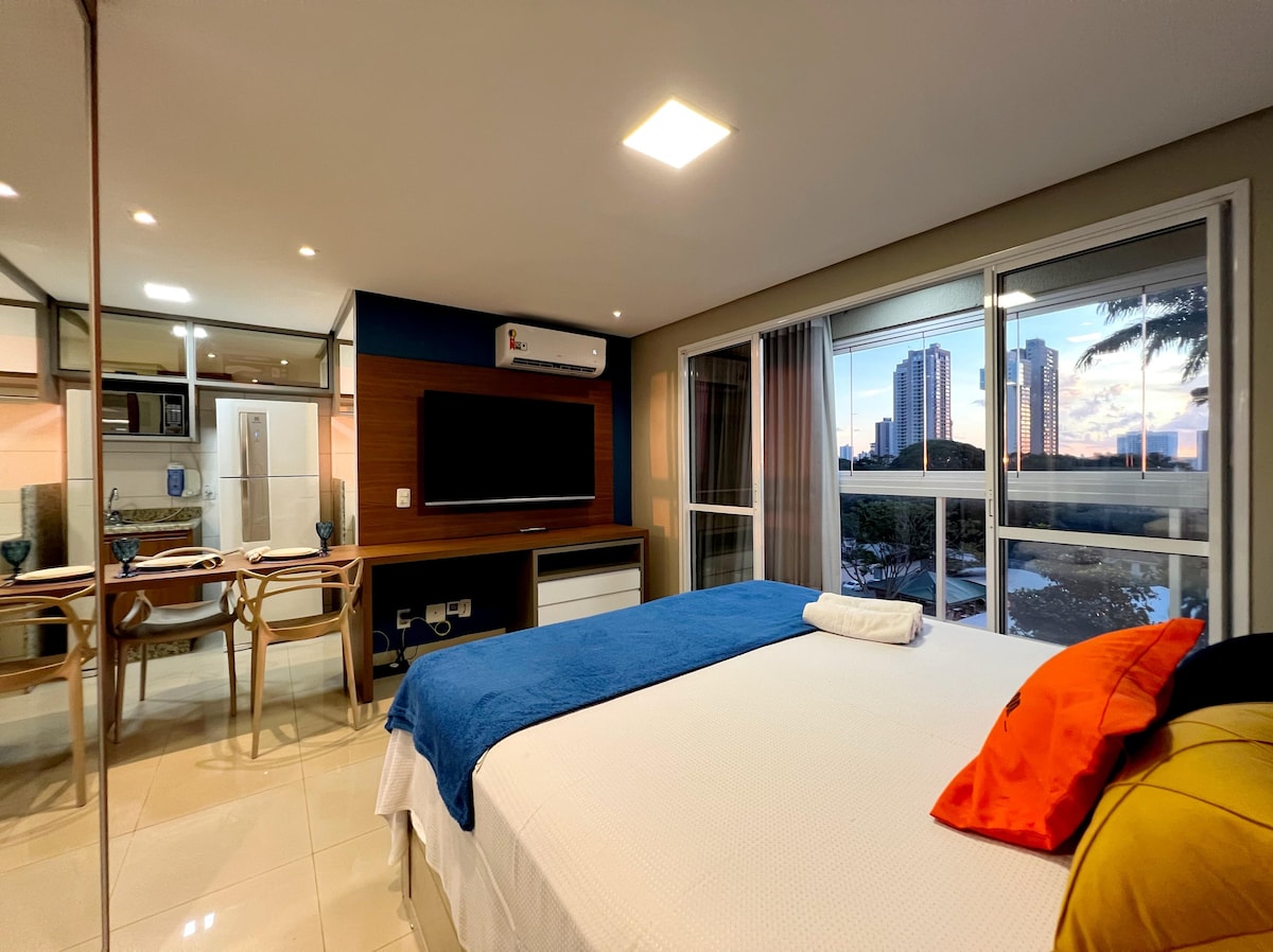 Stan od 2 apartmana na 23. spratu, super udoban, nalazi se u blizini raskošnog parka i pored supermarketa Šećerna štruca, Nalazi se u najplemenitijem regionu Goiânia, Netflix prijavljen, Wi-Fi, PAMETNI TV 50'' , klima-uređaj u 02 sobama, trpezarijski sto, mikrotalasna peć, ploča za kuvanje, roštilj, fen za kosu, balkon sa visećom mrežom i najlepšim pogledom na grad.
