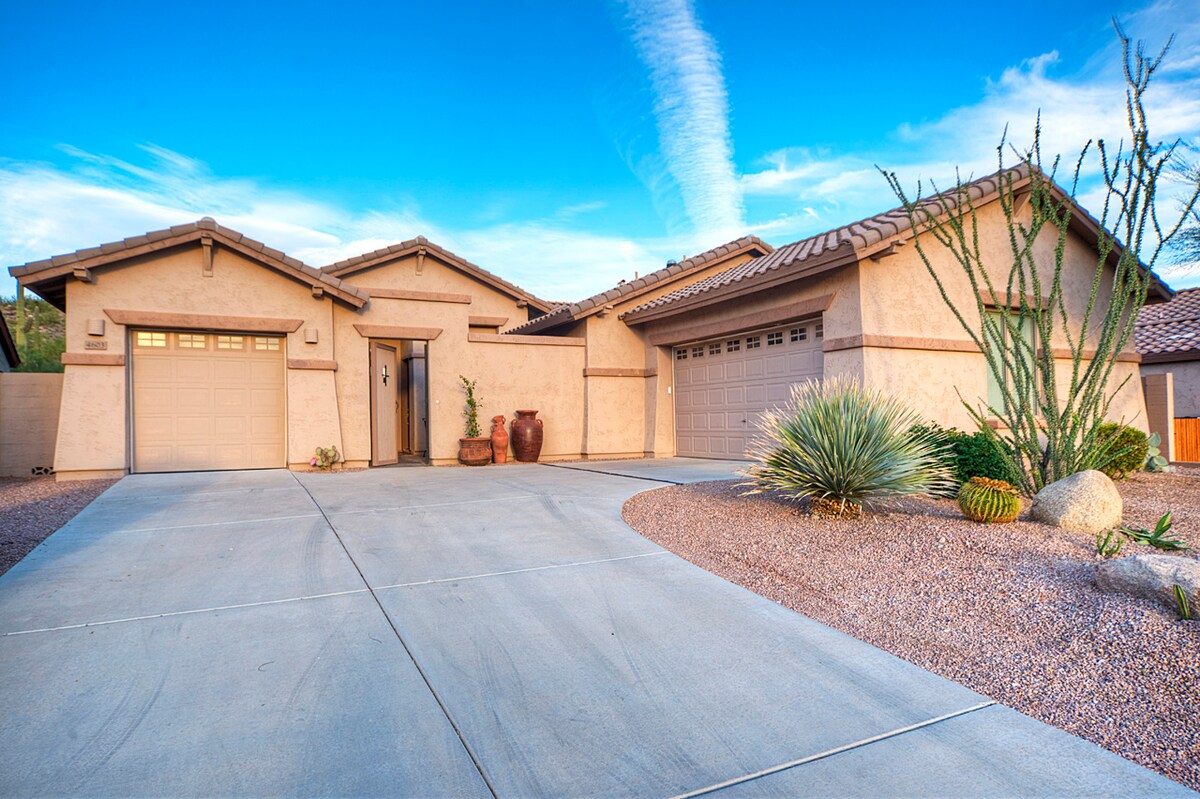 Casa de Jonge is located in Gold Canyon, 45 minutes from the Phoenix airport in the Superstition Foothills. Svi su dobrodošli! Prostrana trosobna soba (uključujući bračni apartman), kupatilo sa teretanom, veličanstvenim pogledom na planine i vrhunskom privatnošću koje nudi ograđeno prednje dvorište i pustinjska padina pozadi. Prilagodili smo svaku sobu, naše gostoprimstvo i sadržaje kako bi vaš boravak bio što ugodniji, opuštajući i bezbjedniji. Rezervacija za 8 osoba uključuje dušek na naduvavanje u teretani.