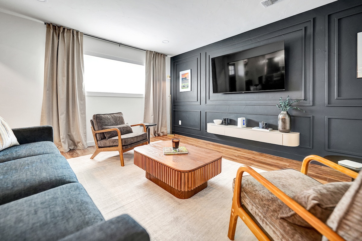 Dobro došli u ovu prostranu i mirnu kuću u gradu, uređenu u modernoj estetici iz sredine prošlog vijeka. Nalazi se u centru grada sa brojnim restoranima, prodavnicama i supermarketima u krugu od 2 milje (7 minuta vožnje). Bilo da ste ovdje za odmor za parove ili poslovno putovanje, tu smo da vam pružimo opuštajući i udoban boravak!