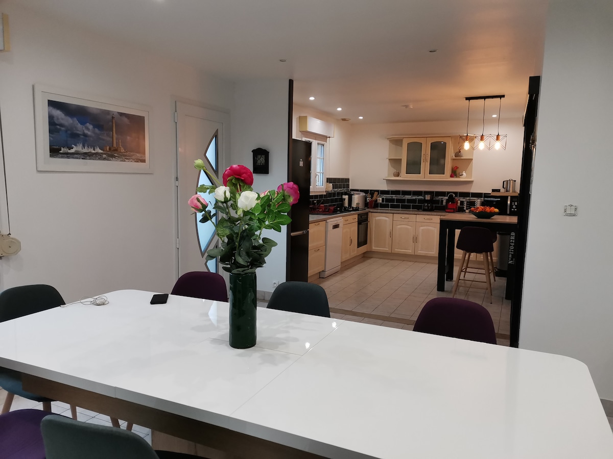 A 10 min de Cherbourg, notre maison est située sur les hauteurs de Bretteville dans un petit hameau. Ce lieu vous offrira le calme de la campagne avec une vue mer. Proche des plages du débarquement (30min), du Mémorial de Caen (1h15), du Mont Saint Michel (2h), Sainte Mère Eglise (25), la Cité de la Mer (aquarium, sous-marin, exposition sur le Titanic...), le parc animalier de Montaigu la Brisette (20min). Barfleur, les huîtres de St Vaast la Hougue, Gatteville Phare, La Hague...