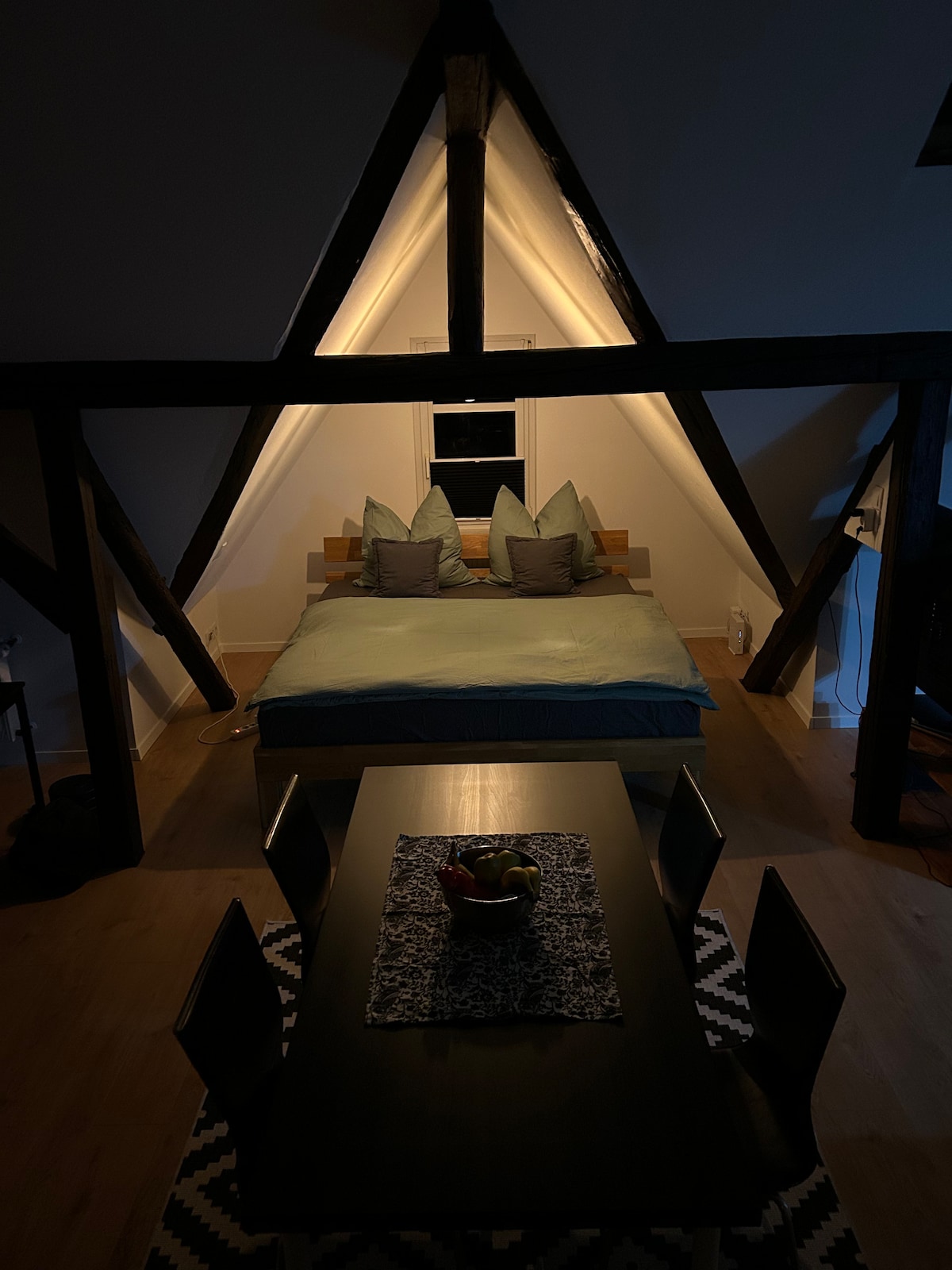 Die Wohnung (58 m²) liegt zentral und befindet sich im 2. Obergeschoss eines denkmalgeschützten Hauses. Sie besteht aus einem Schlafzimmer, einem separaten Wohnzimmer, einer Küche und einem Badezimmer. Eine kleine Dachterrasse ist für sportliche Gäste über das Badezimmerfenster zugänglich. Die Wohnung ist individuell, stilvoll und funktional eingerichtet. Fahrräder können bei Bedarf untergestellt werden. Der Naumburger Dom sowie der Marktplatz sind in etwa 5 Gehminuten erreichbar.