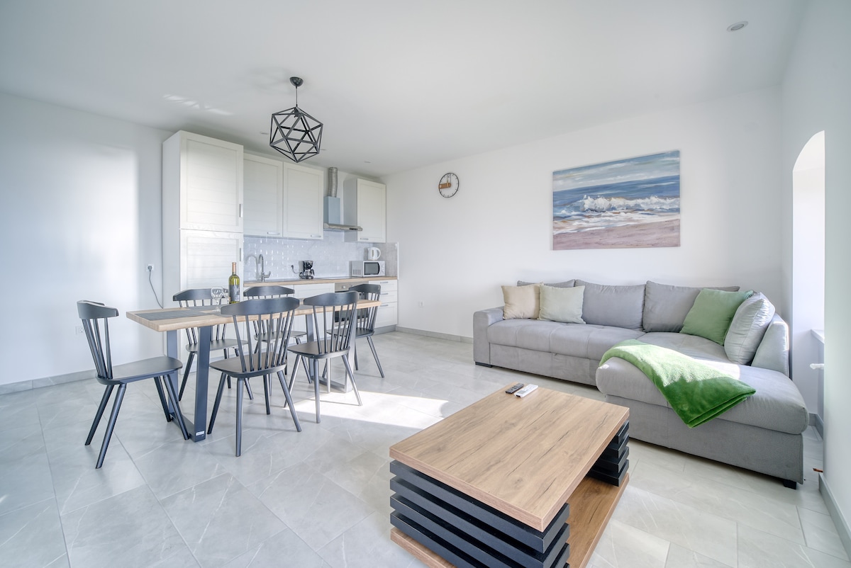 Stan 3 sa samo nekoliko koraka do internog preljevnog bazena i prelijepe terase. Savršeno mjesto za porodice ili parove s djecom. Naš stan ima stilski namještene 2 spavaće sobe sa udobnim bračnim krevetom, što vam garantuje miran san. Dnevni boravak je opremljen kaučem na razvlačenje koji pruža dodatni prostor za spavanje za 2 gosta.