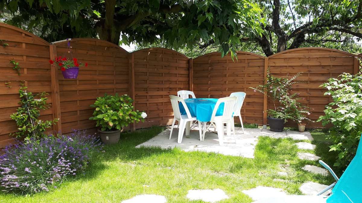 Šarmantna mala samostojeća kuća, koja se sastoji od 1 velikog dnevnog boravka sa sofom na razvlačenje, 1 potpuno opremljene kuhinje sa barom, rernom, mašinom za pranje sudova, frižiderom sa zamrzivačem, mikrotalasnom rernom, 1 spavaća soba u mezaninu otvorena za dnevni boravak sa 1 krevetom u 160, 1 kupatilo sa tušem i toaletom. Flat screen tv, dvd plejer, hi-fi sistem, društvene igre, knjige, cd, dvd, veš mašina. WiFi Zemlja sa drvećem. Tiho i bučno okruženje... prelepa terasa sa roštiljem, baštenski nameštaj. Krevet je namešten po dolasku.