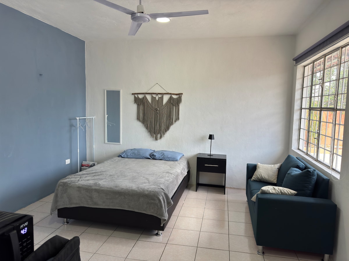 Acogedor estudio en segundo piso con todo lo esencial para una estancia tranquila y confortable. Conveniente para viaje de negocios, trabajo o vacaciones en un ambiente seguro. Ubicado justo al norte de la ciudad, a un costado del CICY, cerca del Siglo XXI, Museo Maya, Plaza Galerías y Harbor. A unos 20 minutos del centro y 30 de la playa. Restaurantes accesibles con comida variada. Estacionamiento libre en la calle con mucho espacio. A una cuadra de las paradas de los autobuses urbanos.