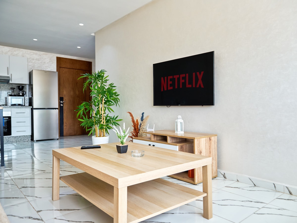 Uživajte u profesionalnom boravku ili samo obilasku znamenitosti sami ili kao par? Uživajte u mirnom smještaju u novom centru Kazablanke. 79 m2 stan Odlična lokacija: 1 min Anfa Park Dva minuta od tramvaja i autobusa Dva minuta od tržnog centra (Aeria Mall ) 10 minuta od plaže Ovaj stan je nov i moderan. OPTIČKI WI-FI 50MG, Smart TV i prostor za rad. Tržni centar je odmah pored zgrade sa restoranima i kafićima Supermarket i drugim sadržajima