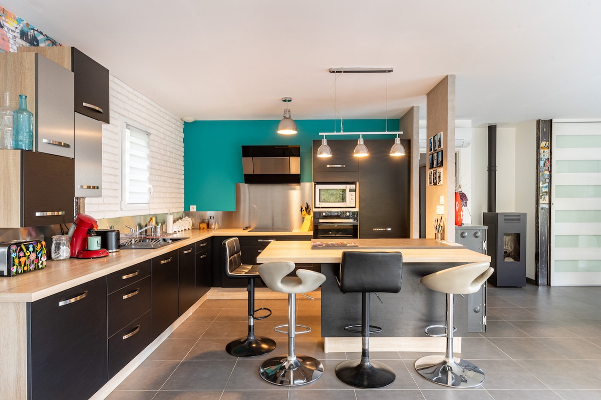Détendez-vous dans cette maison de ville de 85 m² cocooning et élégante, au coeur de Bruguières. Arrivez en toute autonomie (boîte à clefs) et profitez des commodités à pied et des animations du centre-ville, tout en bénéficiant du calme d'une impasse. Vous serez aux portes de Toulouse, à 1km de la sortie n°11 St Jory (autoroute A62), à 20 minutes du Capitole. Cette maison sera idéale pour un séjour en famille, entre amis ou pour le travail.
