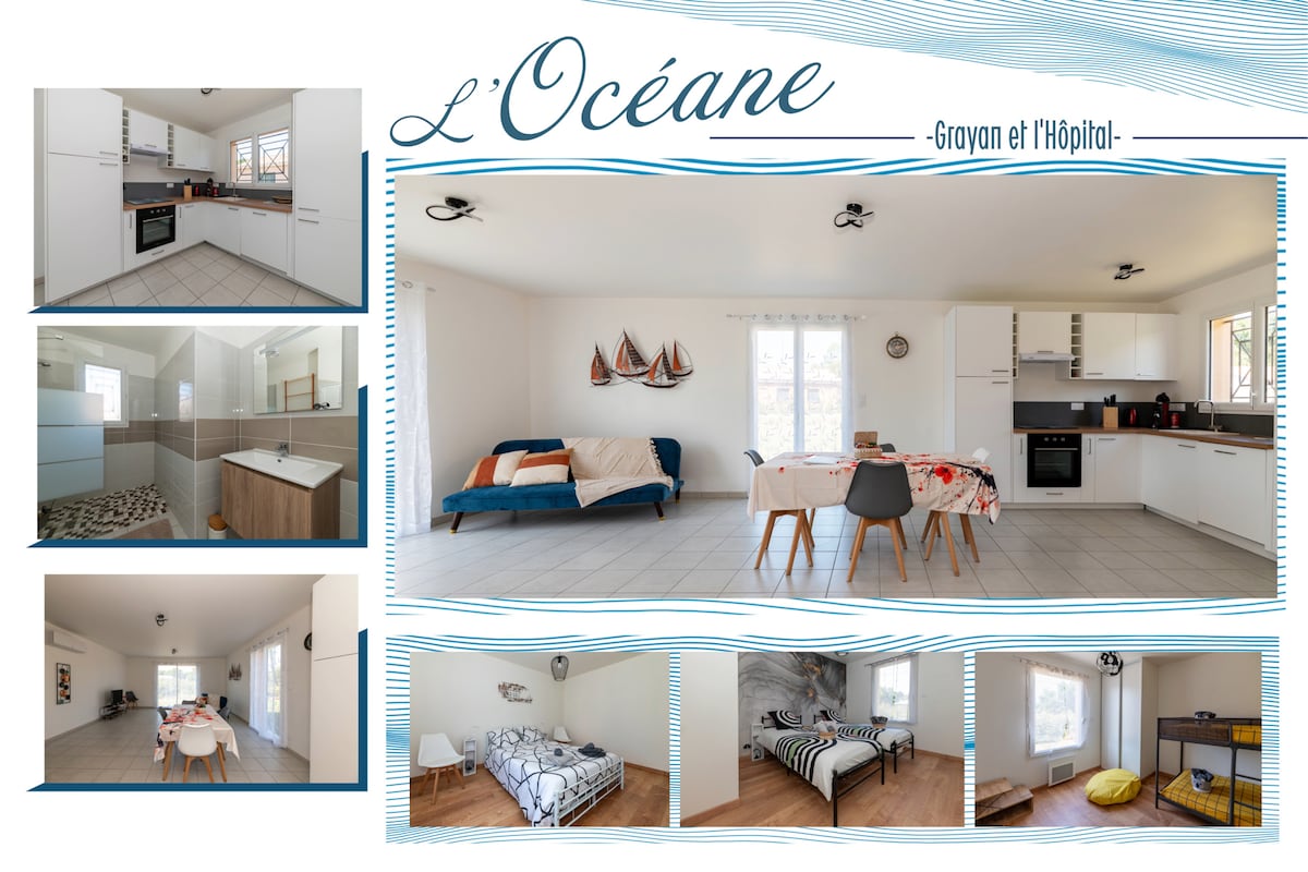Novoizgrađena kuća od oko 60 m2, 2 spavaće sobe, 5 kreveta i 1 krevetac. Kuhinja s dnevnim boravkom i prozorom s pogledom na veliku drvenu terasu od 110 m2 s pogledom na baštu i šumu. Ne zanemareno. Mašina za veš, TV, Wi-Fi , pojačalo . Dva bicikla, uključujući jedan sa dečijim sedištem. U srcu poluostrva Medok, ova lijepa stambena kuća u Grajanu i bolnica, ponudiće vam mir i spokoj i svu udobnost za odmor.