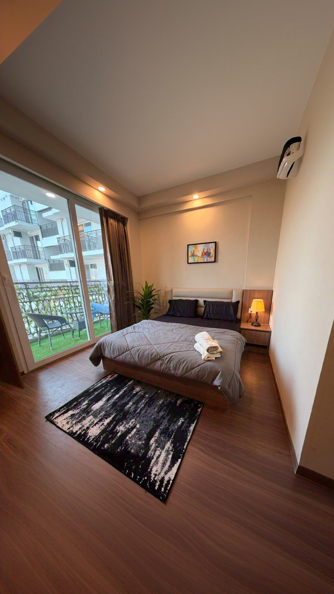 Opustite se u ovom mirnom i luksuznom studiju s toplinom doma i atmosferom luksuznog hotela. Opremljen plišanim bračnim krevetom i modernim dekorom. Sadržaji: Prodavnica prehrambenih proizvoda non-stop Moderna čajna kuhinja Brzi Wi-Fi i TV Bezbjedan parking ispred tornja, ali bezbjedan non-stop Prva dva sprata imaju komercijalne prodavnice koje nude: Usluge pranja veša Salon Kafić Medicinska prodavnica Jednostavan pristup India Expo Mart-u, Buddh International Circuit. Savršeno za parove, putnike koji putuju sami ili poslovne partnere.