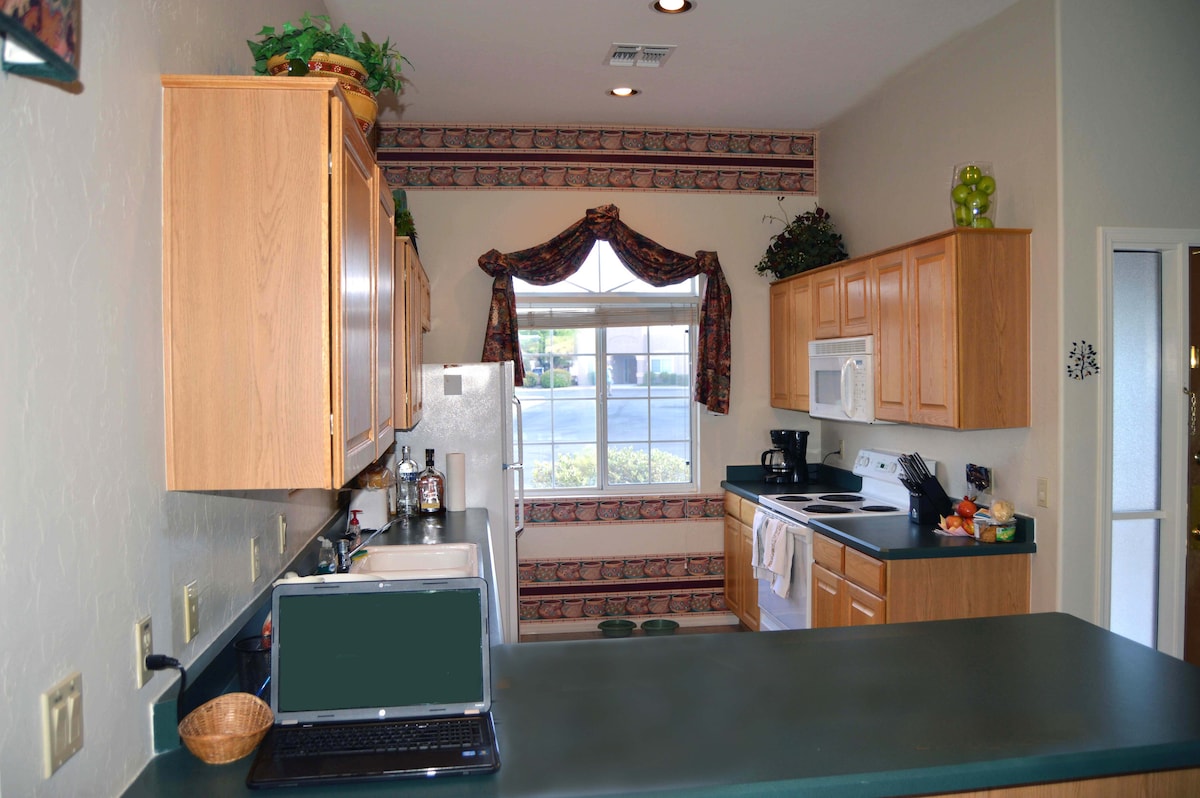 Located within a popular southwestern AZ resort at an elevation of 2900 feet (which results in lower temperatures and spectacular mountain and high desert views. Our area's average temperature, January through April is 74 degrees. The annual average temperature is 85 degrees. You will reside in an up-scale 3 room suite. The property was completely refurbished in 2014. Work was completed in June at an expense of over $20,000. Included in the refurbishments were: all new carpet, all interior walls painted, new tables and 6 chairs, a new sofa, new washer/dryer, new headboards, a new flat panel HDTV in the MBR, improved sound proofing, new housewares, new linens, blankets and towels, and silverware. The suite comes with a full set of amenities, including linens, towels, blankets, coffeemaker, refrigerator, toaster, 2 wide screen high definition (HD) local cable TVs, Wi-Fi Internet and microwave. The kitchen has a range/oven, dishwasher, cookware, and dishes. The dining area has a table and 4 chairs plus two bar stools at the counter top, A new washer/dryer is available in a closed space, near a large walk-in closet and roomy vanity area. We are members of the Green Valley Recreation (GVR) Centers which have 13 recreational facilities (more than 18 million dollars in facilities) within an 8 mile radius, that are available to our guests for a modest fee. GVR offers swimming, physical fitness facilities, tennis courts, continuing education classes, art and crafts clubs, and social events. Both a restaurant and a golf course are within walking distance. There are four golf courses within five miles and over ten restaurants within 10 miles.