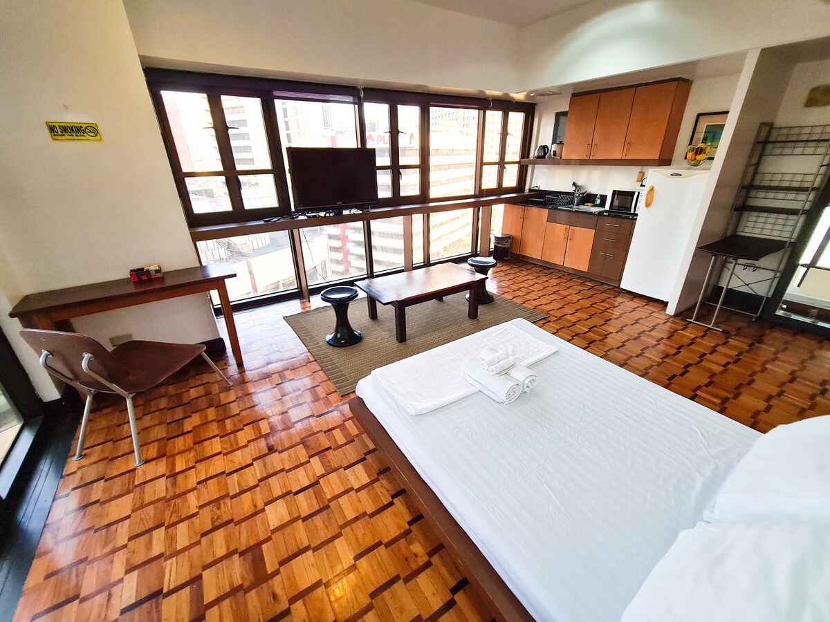 Ovo je veći studio apartman, sa nedavno renoviranim elegantnim enterijerom i svim udobnostima, na strateškom mjestu, imate udoban kutak sa bračnim krevetom i dnevnim prostorom koji pruža osećaj kao da je u pitanju zasebna soba. Vaš dom se nalazi u najboljem delu Makatija – pređite ulicu i naći ćete se u Grinbeltu, sa desetinama restorana i stotinama prodavnica. A na ulicama oko Legazpi Village-a naći ćete neke od najlepših restorana i barova u celoj Manili.