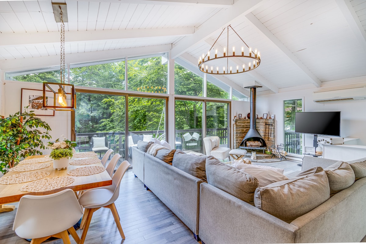 Dobro došli u planinsku kuću s krovnim prozorom: pobjegnite u našu mirnu brvnaru s kosim krovom koja se nalazi u mirnoj šumi planina Pokono. Smješteno na skoro hektaru bujnih šuma i stijena, naše utočište nudi savršenu ravnotežu udobnosti, udobnosti i opuštanja. Opustite se u hidromasažnoj kadi pod zvijezdama, podmladite se u sauni ili se okupite oko ognjišta i uživajte u prijatnim večerima sa prijateljima i porodicom. Bez obzira na to da li tražite avanturu ili mirno opuštanje, naša brvnara pruža mirno utočište za vaš odmor.