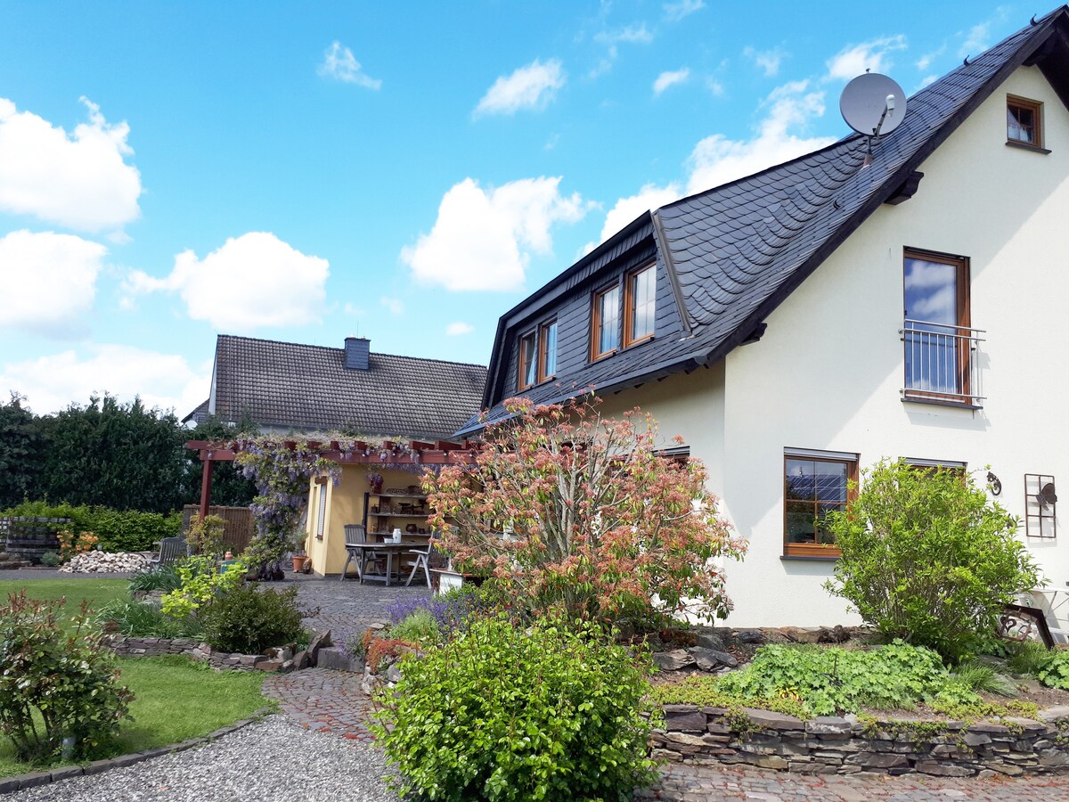 Dragi gosti, Ako tražite smeštaj na svojoj putnoj etapi ili polaznu tačku za pešačenje, obilaske motociklom ili vožnje biciklom u opuštajućoj atmosferi, rado ću vas dočekati. Čeka vas udobna soba od oko 25 kvadratnih metara sa privatnim kupatilom. U bašti je dostupna mala kuhinja. Mosel 15 km, viseći kablovski most Geierlay 20 km. U našem području ima mnogo pešačkih staza koje vas pozivaju na pešačenje. Radujem se vašoj posjeti 😊