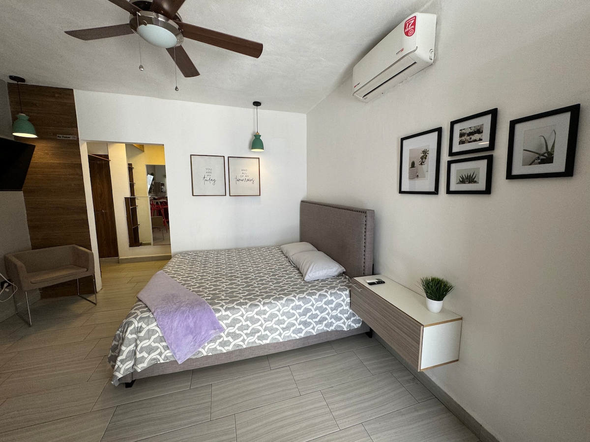 Cómodo departamento privado y amueblado que cuenta con cocineta (electrodomésticos, vajilla y utensilios de cocina), baño privado (toallas, jab y abanico de techo. Con todos los servicios incluidos y papel higiénico), closet (plancha y ganchos), cama matrimonial (almohadas, sabanas y edredón), mesa con 2 sillas, smart TV, aire acondicionado (frío/caliente)