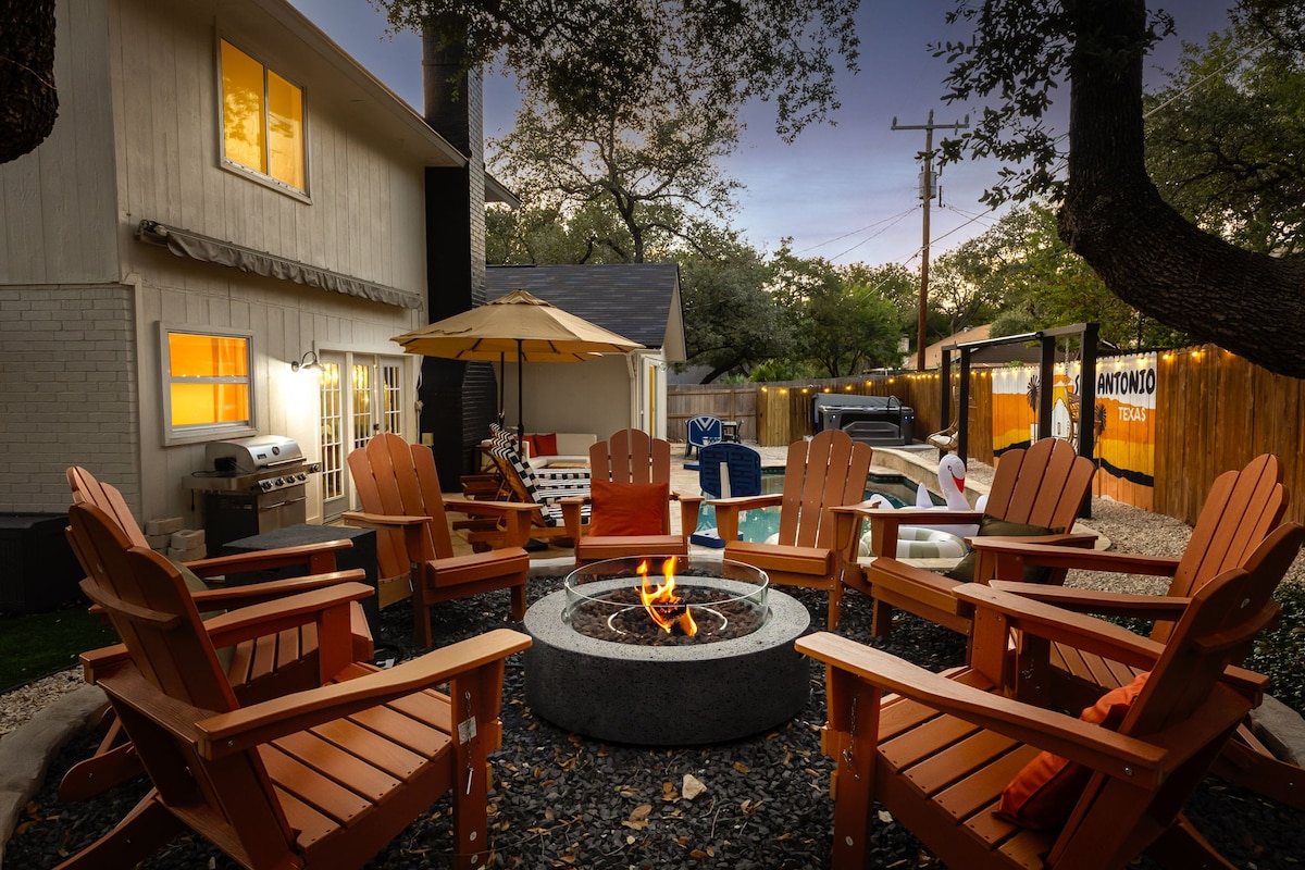 Lots of indoor and outdoor entertainment for the entire family! The theater room is great for movie night, karaoke and gaming! Our spacious home has a theater room with 120-inch projector screen, Xbox Series S, PlayStation 5, Karaoke and Dolby Atmos surround sound. Outside has a wood firepit & propane firepit, and a Heated in-ground pool! The pool is 20x10 and 5 ft deep. We provide plenty of seating to accommodate a large group. The Alamo 5mi, Riverwalk 4mi, Alamodome 6mi, Convention Ctr 5.5mi