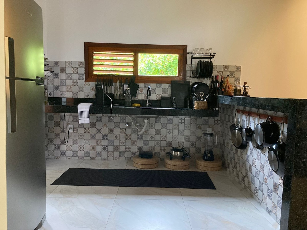 Imamo kuhinju opremljenu aparatima i posuđem za kuvanje, tu je i društveno kupatilo, apartman ima prostor za bračni krevet i viseću ležaljku, zatvoreni smo fiokama i malim stočićem, to je veoma svetao i provetreni apartman, sa Wi-Fi mrežom sa prelepim pogledom na šumu koja se nalazi pozadi. Nalazimo se u zajednici Linha da Serra, 8 km od centra Guaramiranga na 900 m nadmorske visine.