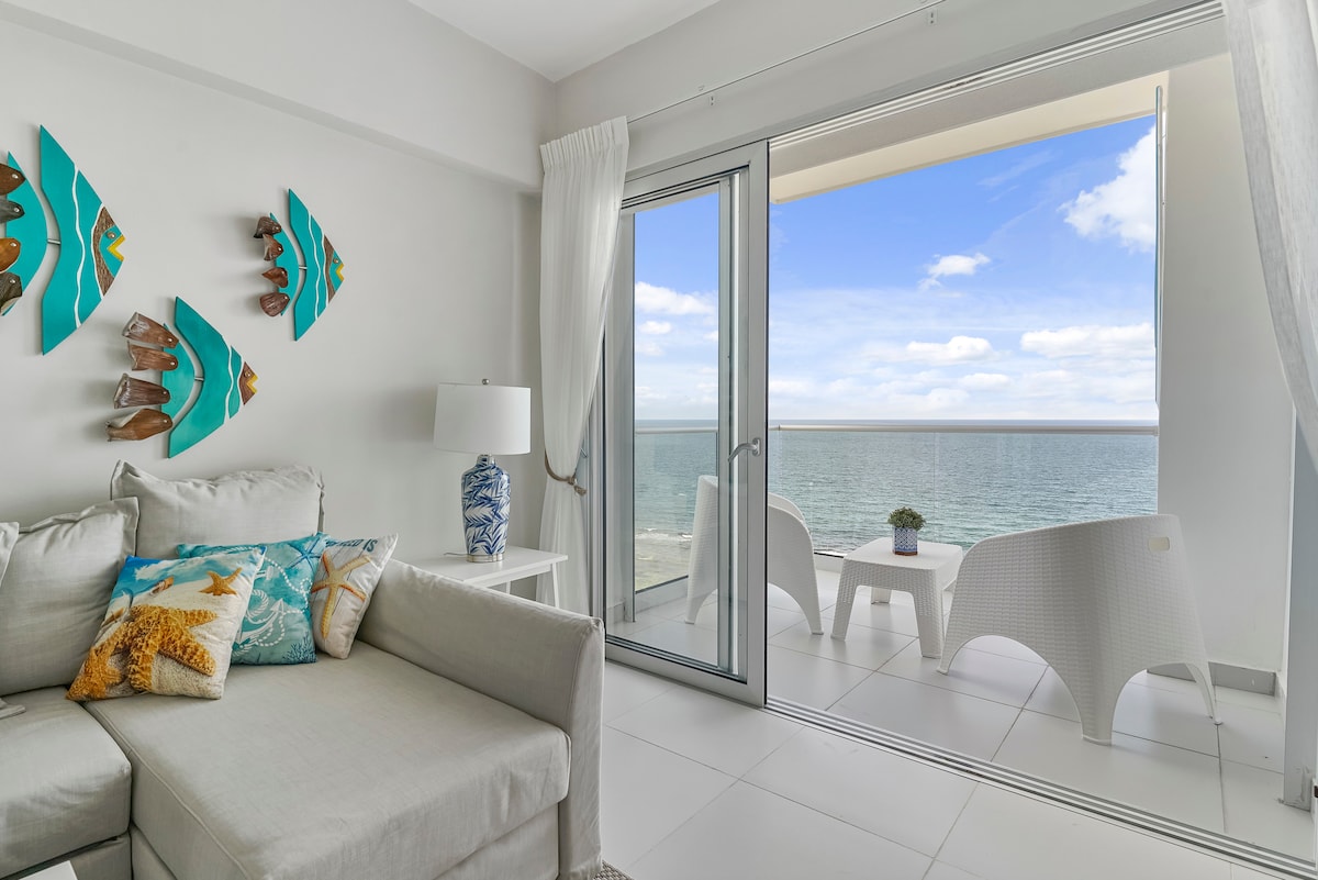 Newly decorated cozy apartment for couples with ocean view from the living room/balcony and bedroom, strategically located next to the main Ave. Just 25 mins away from Las Americas Airport and walking steps by the beach in private building called Torre Aquarella. Social areas with swimming pool with direct access to Juan Dolio beach, sauna, gym and bar. This accommodation has everything you need for the perfect getaway, hotel services such as check in counter, restaurant, concierge and more.