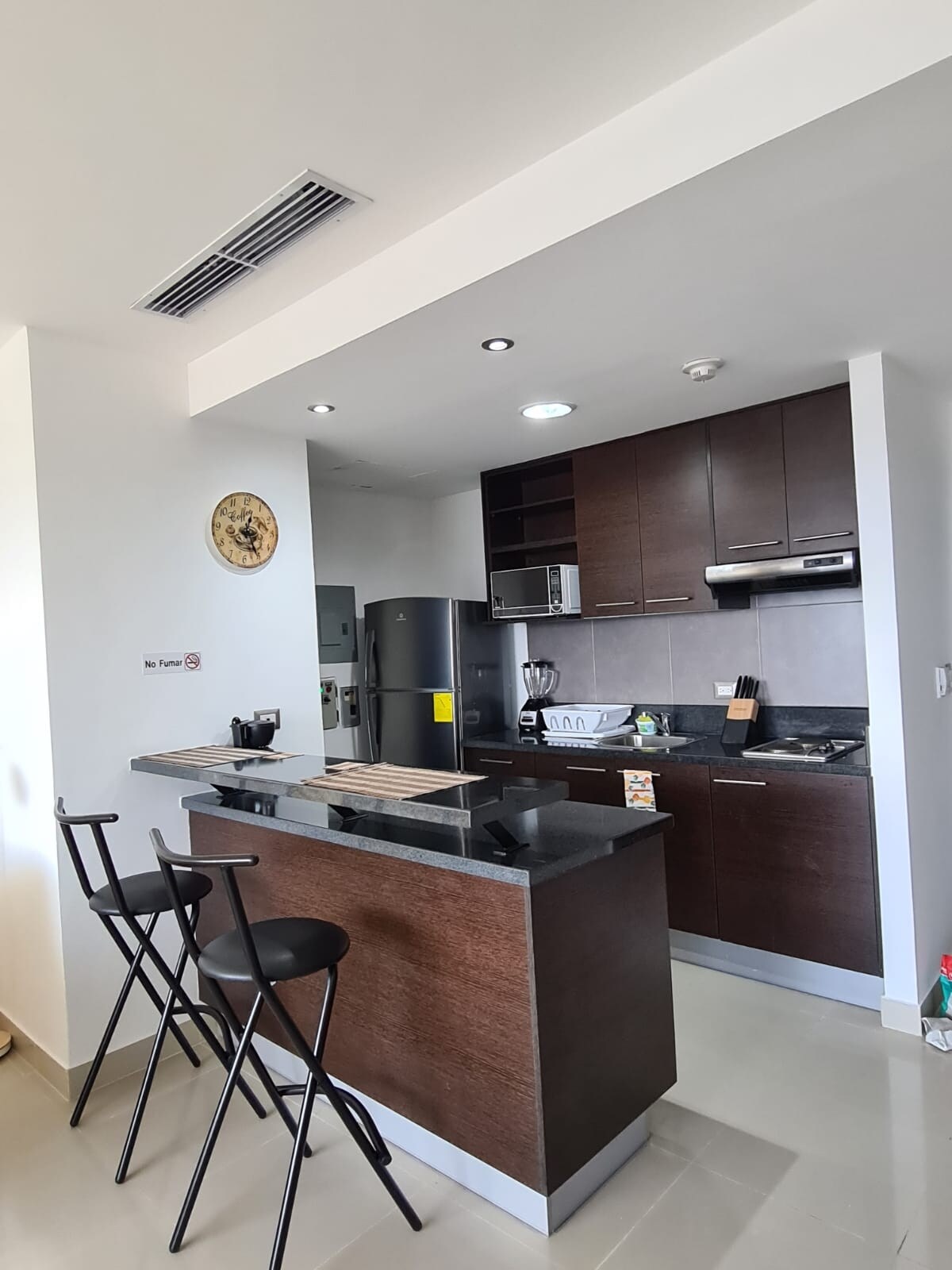Stan je kompletno renoviran. Bela je prevladavajuća boja u stanu koja daje osećaj amplitude i slobode. Dekoracija je minimalistička, sa drvetom kao što su završne obrade na podu, vrata od tikovine, kreveti i noćni ormarići. Pogled je neverovatan sa pogledom na brdo Santa Ana, reku Gvajas i grad. U zgradi je recepcija dostupna non-stop, a bezbjednosne kamere su svuda, vrlo bezbjedna zona i zgrada.
