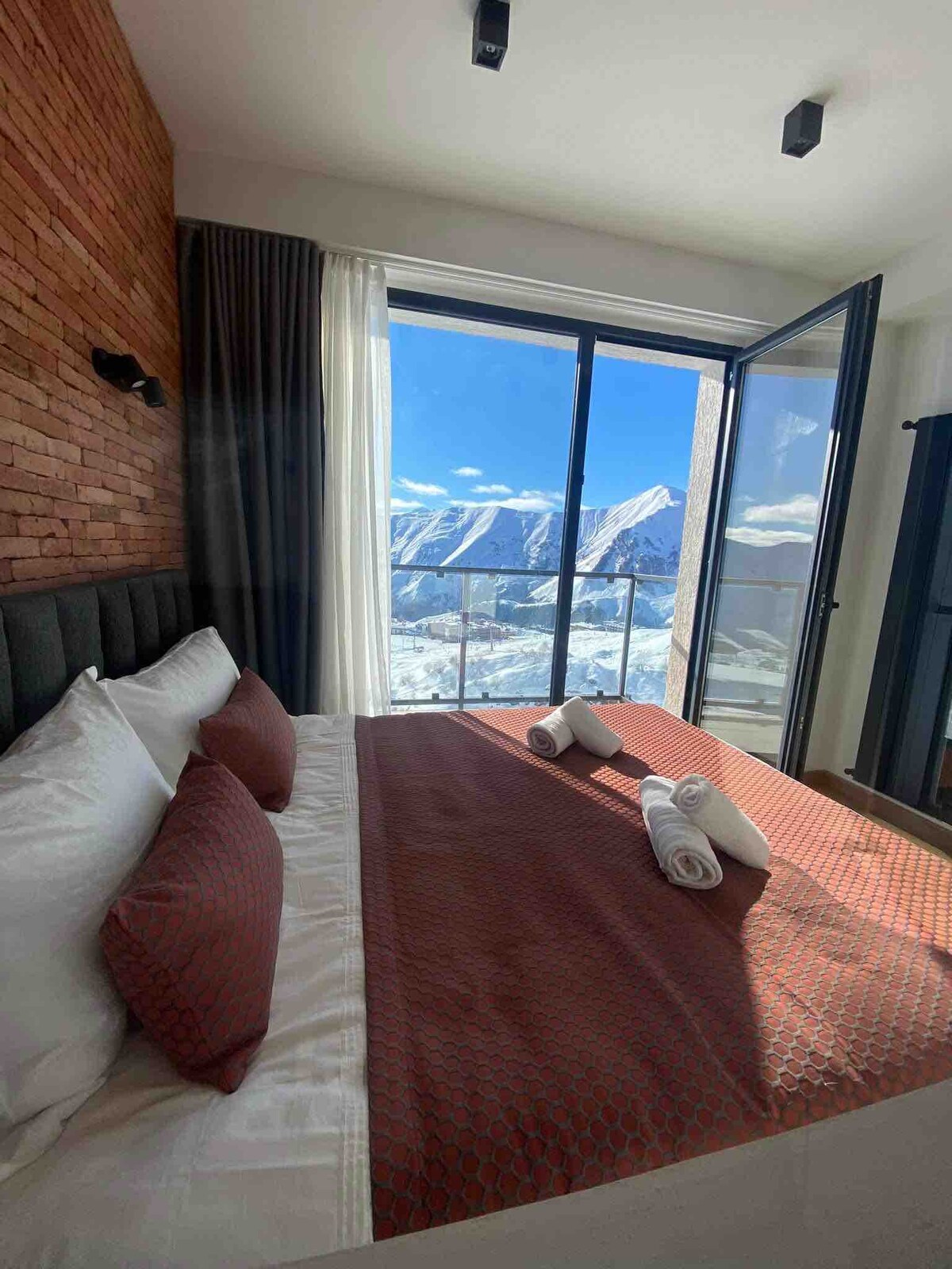 Predivan apartman u atmosferi planinske kuće sa panoramskim pogledom na planine nalazi se u srcu skijališta Nju Gudauri 2300 m iznad mora, u rezidenciji BLIZANCIMA. Minimalistički dizajn, prirodne teksture i epski pogled. Uživajte u fantastičnom pogledu na dolinu Gudauri i skijašku stazu, kao i u zalascima sunca koji oduzimaju dah dok se okupate. Planinski potoci, neprestano promenljivo nebo, stada stoke sa pastirima i nezaboravne grmljavinske oluje noću leti. Popularni Kazbegi je udaljen 40 minuta vožnje.