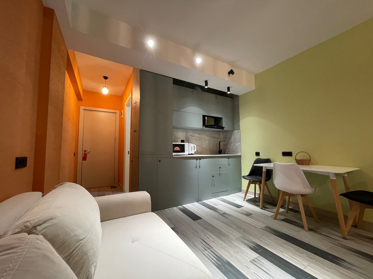 Well decorated and furnished Studio Hotel apartment with spectacular mountain view from both balcony and large king size bed, so you can enjoy the spectacular view from balcony or from the bed, it is located in the 2nd floor of loft 2 building of Redco Complex in Heart of New Gudauri, right next to Gondola Ski lift. The apartment has unique design, stunning mountain view from balcony. The apartment has super great location in the centre for those who like Skiing & other snow and mountain sports.