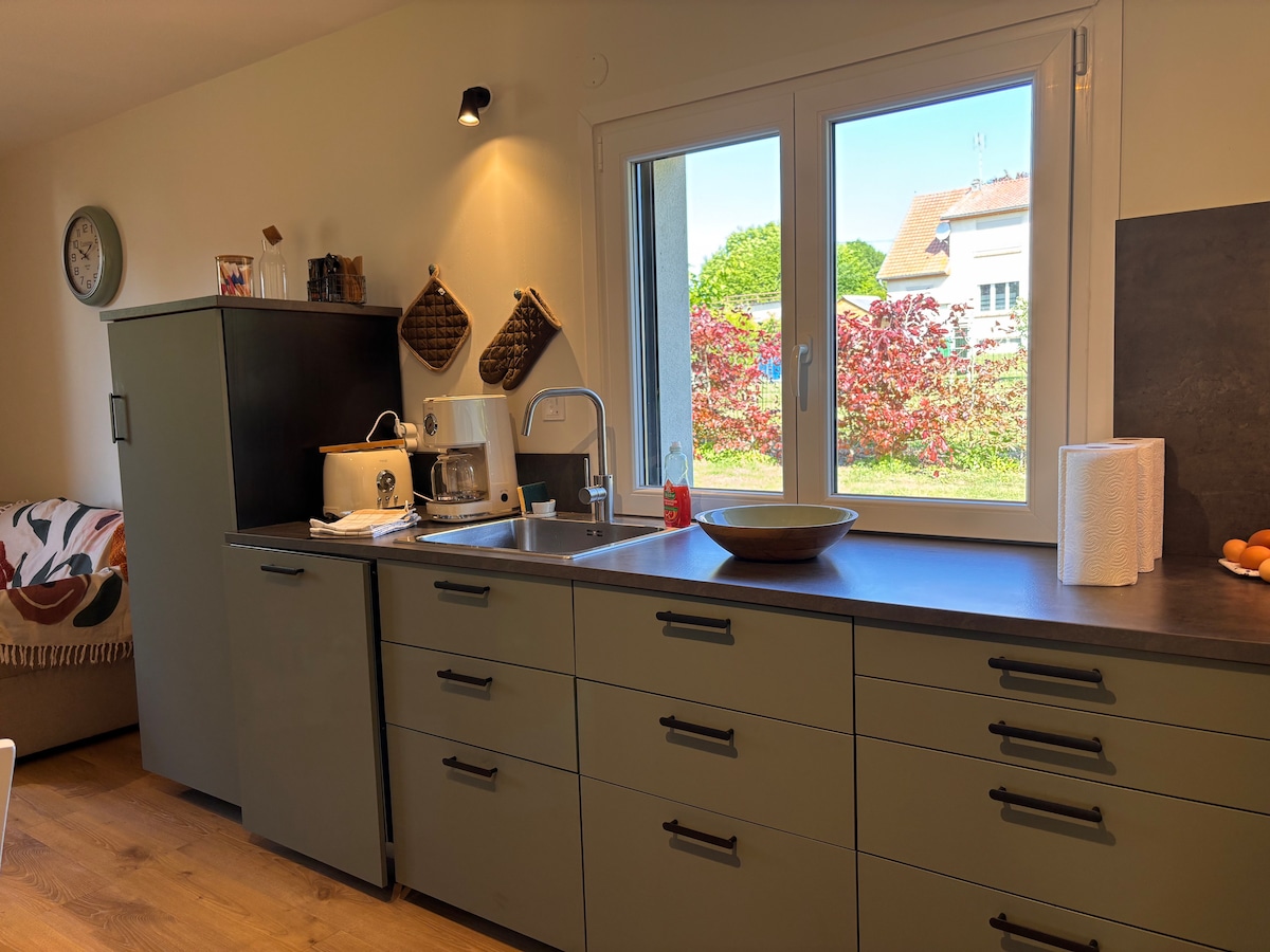Ovaj mirni dom nudi opuštajući boravak za cijelu porodicu. Samostalna kuća u veoma svetloj prirodi. Opremljena kuhinja sa mašinom za sudove, frižiderom, MO, mini rernom, aparatima (fondue, raclette, pierrade), tosterom, kuvalom za vodu, aparatom za filter kafu, usisivačem. Punjač za električna vozila. Pametni TV, stoni fudbal, društvene igre. Kupatilo sa duplim umivaonikom i tuš kabinom. Nalazi se u blizini železničke stanice Bizini (manje od 10 minuta hoda)