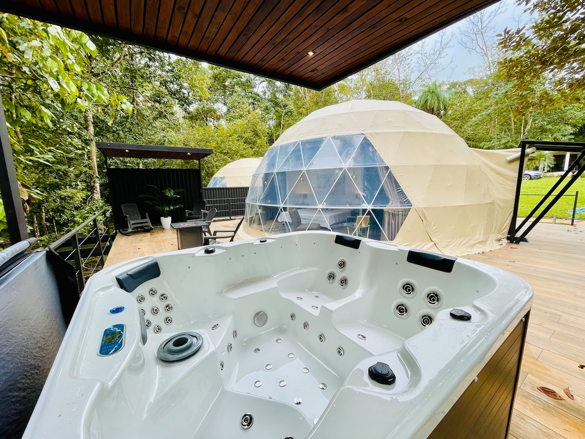 Escapá al confort de nuestro domo glamping con jacuzzi, rodeado de naturaleza y vistas espectaculares. Disfrutá una cama queen, baño privado con agua caliente, mezzanine, sofá, mecedoras, TV 4K e internet. Ubicado en Finca Ecológica Jamaicensis, en Zarcero, donde el descanso, la magia del bosque y el cielo estrellado te esperan. Ideal para parejas y amantes de la naturaleza.