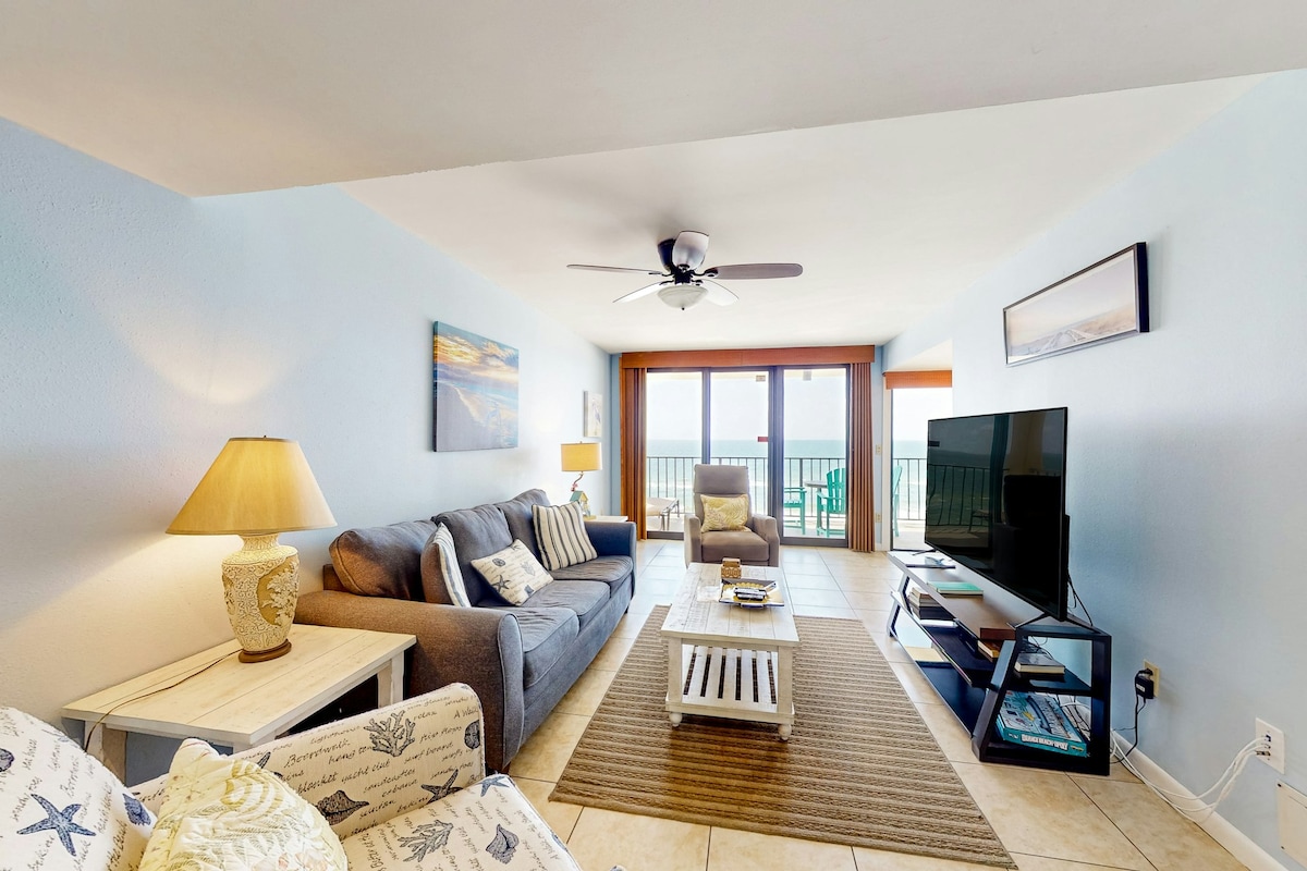 Odmorite se u ovom novouređenom kondominiju na uglu 9. sprata. Možete da se opustite znajući da je sve što vam je potrebno zbrinuto - posteljina i luksuzni dekor sa 5 zvjezdica, potpuno opremljena kuhinja, mašina za pranje/sušenje veša, peškiri za plažu, ormar za plažu sa kolicima za plažu, stolice, igračke, daske za surfovanje - dok izlazite na balkon od 180 stepeni i uživate na plaži, povjetarac i pustite da vaše brige nestanu. Zatvoreni/otvoreni bazen, dječji bazen, teniski/košarkaški tereni. Rezervišite kod nas još danas prije nego što vaši datumi nestanu!