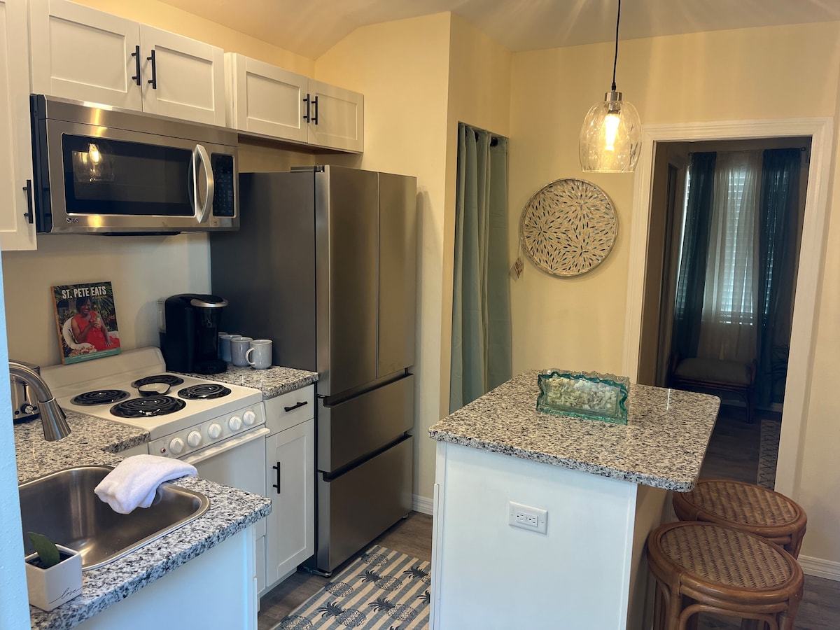 Ako tražite čist i simpatičan smeštaj, oduševiće vas naša garsonjera za goste! Naš savremeni renovirani stan u garaži od oko 350 kvadratnih metara nalazi se u mirnom delu grada sa drvoredima poznatog kao Krescent Hajts. Udaljeni smo 5 minuta vožnje do centra Sent Pita gde možete da probate mnoge sjajne restorane, pivare, muzeje i prodavnice. Plaže u zalivu su udaljene 25 minuta, a centar Tampe je udaljen 40 minuta vožnje. Jedinica ima privatni parking i bračni krevet.